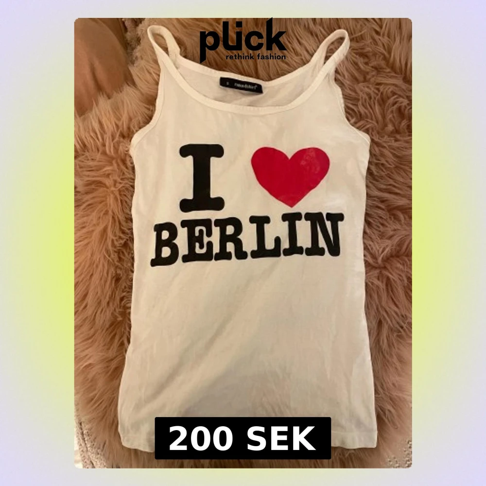 Säljer ett vitt linne från nakedshirt i storlek S med smala axelband och stort tryck på framsidan: I ❤️ BERLIN. Linnet är gjort i mjuk bomull och har en klassisk, rak passform. Aldrig använt på grund av att den är för liten:(