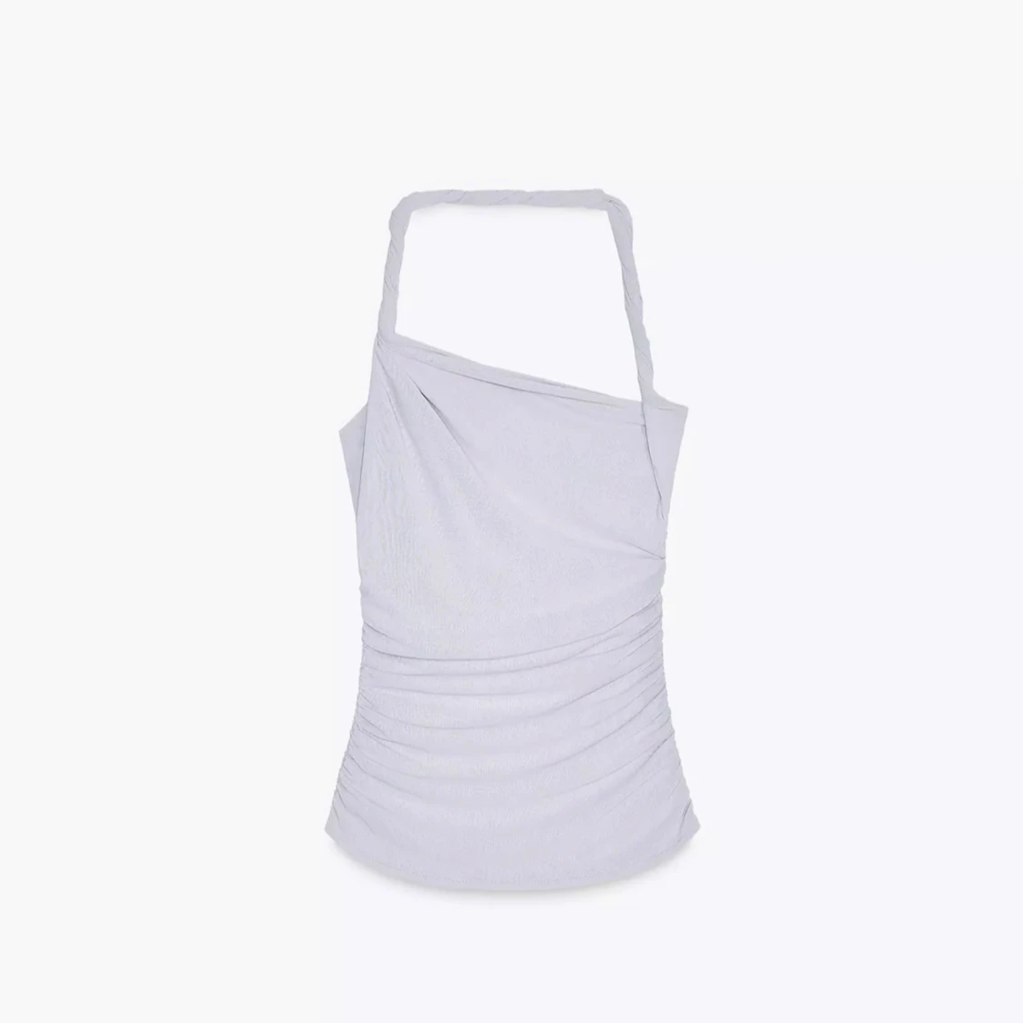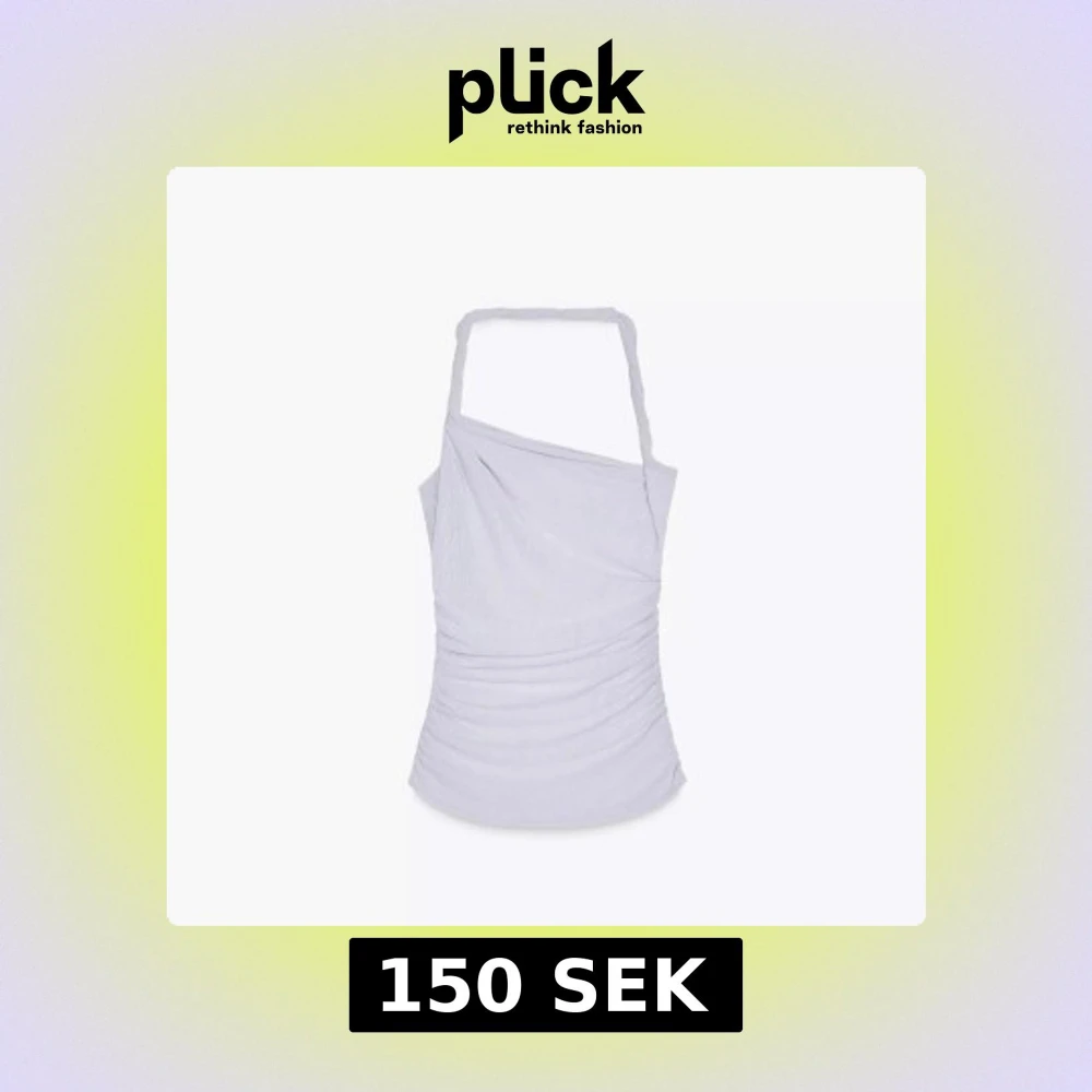 linnetopp med asymmetrisk halsringning och en axelbandslös design på ena sidan. Toppen har draperade detaljer och smal passform, perfekt för att skapa en cool och modern look.