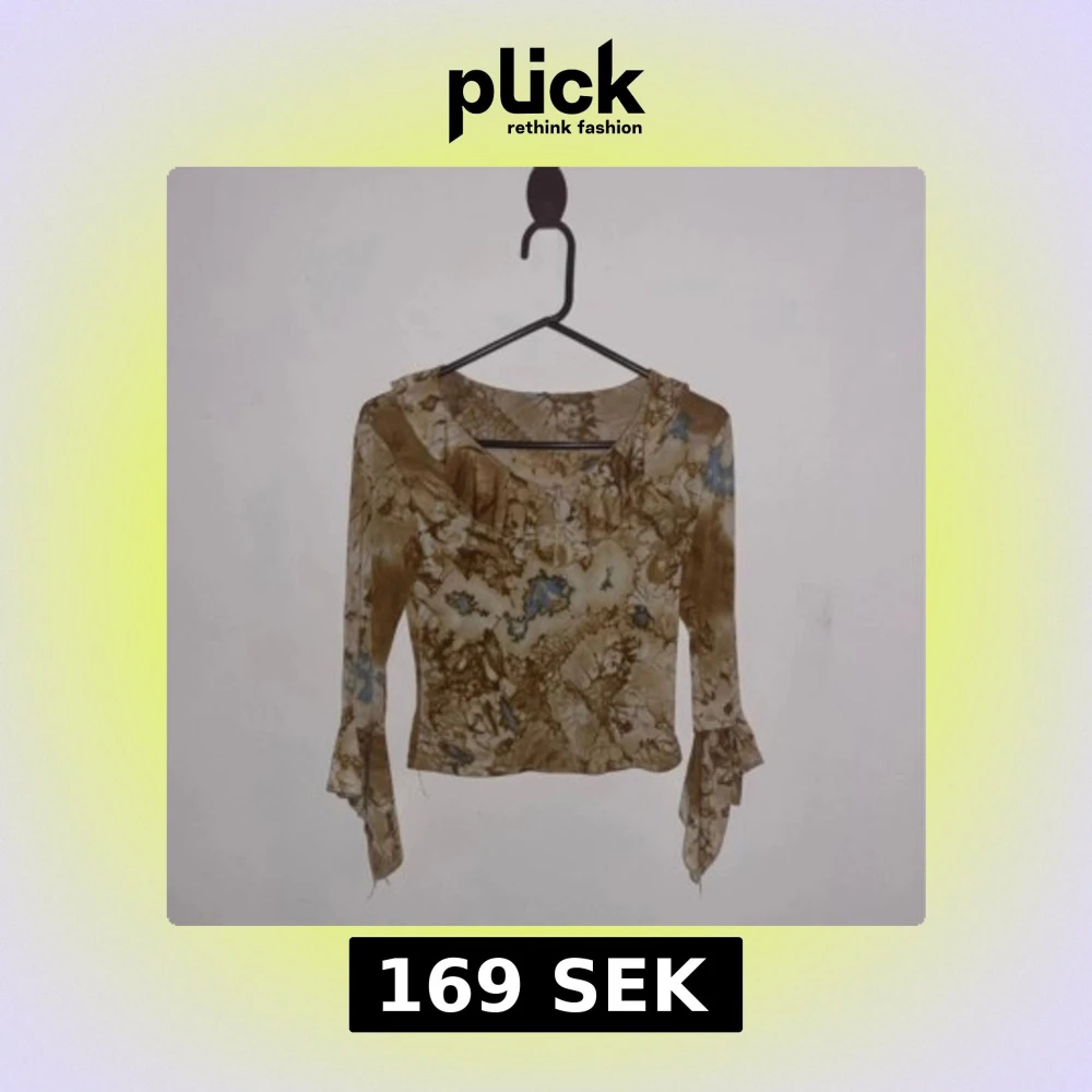 Trendig blus med unikt beige och blått mönster, croppad passform och långa ärmar med volangdetalj vid ärmslut. Perfekt för dig som vill sticka ut med en cool och annorlunda topp. Tunn och lätt i materialet, passar till många olika stilar.