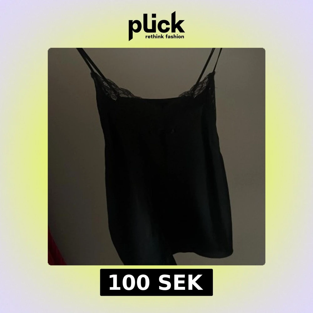 Säljer ett elegant svart linne med tunna axelband och spetsdetaljer vid halsringningen. Perfekt för en stilren look.