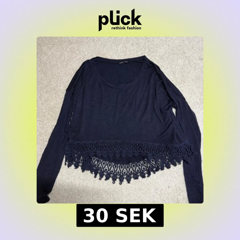 Säljer en mörkblå långärmad topp från Made in Italy. Toppen har en croppad passform och är dekorerad med bred spetskant nertill som ger en extra snygg detalj. Perfekt till jeans eller kjol för en chill men ändå stilsäker look.