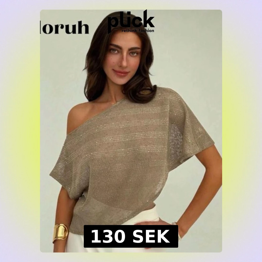 Säljer en beige glittrig topp med offshoulder-design. Toppen är lös och har korta ärmar, tillverkad i ett tunt och lätt syntetmaterial som ger en snygg transparent effekt. Perfekt för dig som vill ha en chill men ändå trendig look.