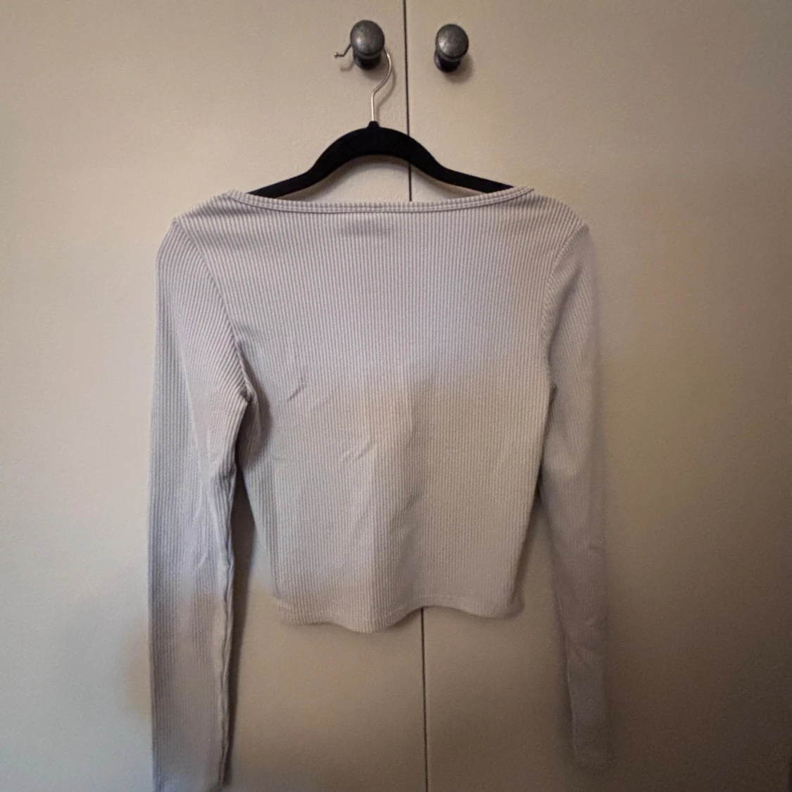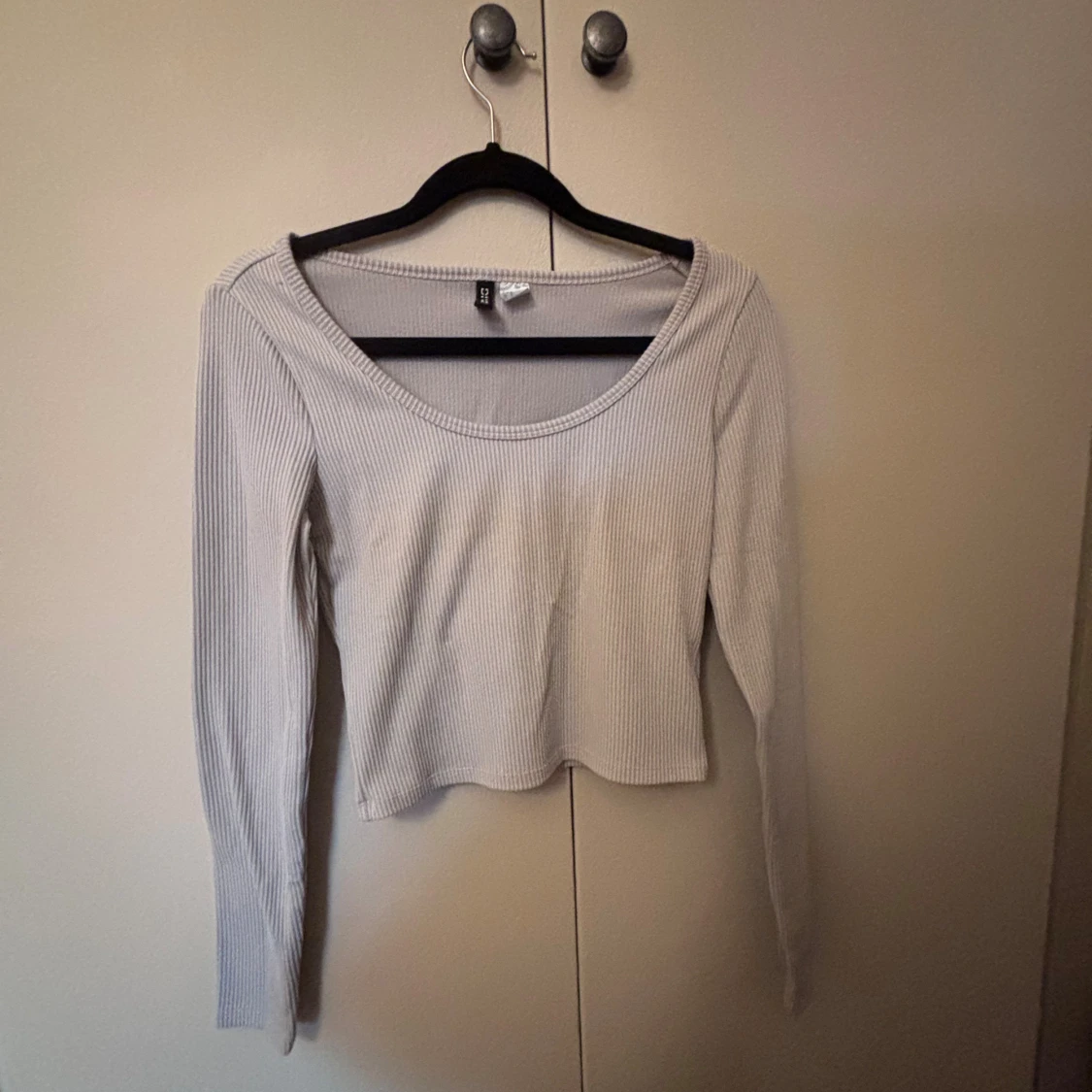 Säljer en ljusgrå ribbad långärmad topp från Divided. Toppen har en croppad passform och rundad urringning. Perfekt att styla med jeans eller kjol för en enkel och snygg look.