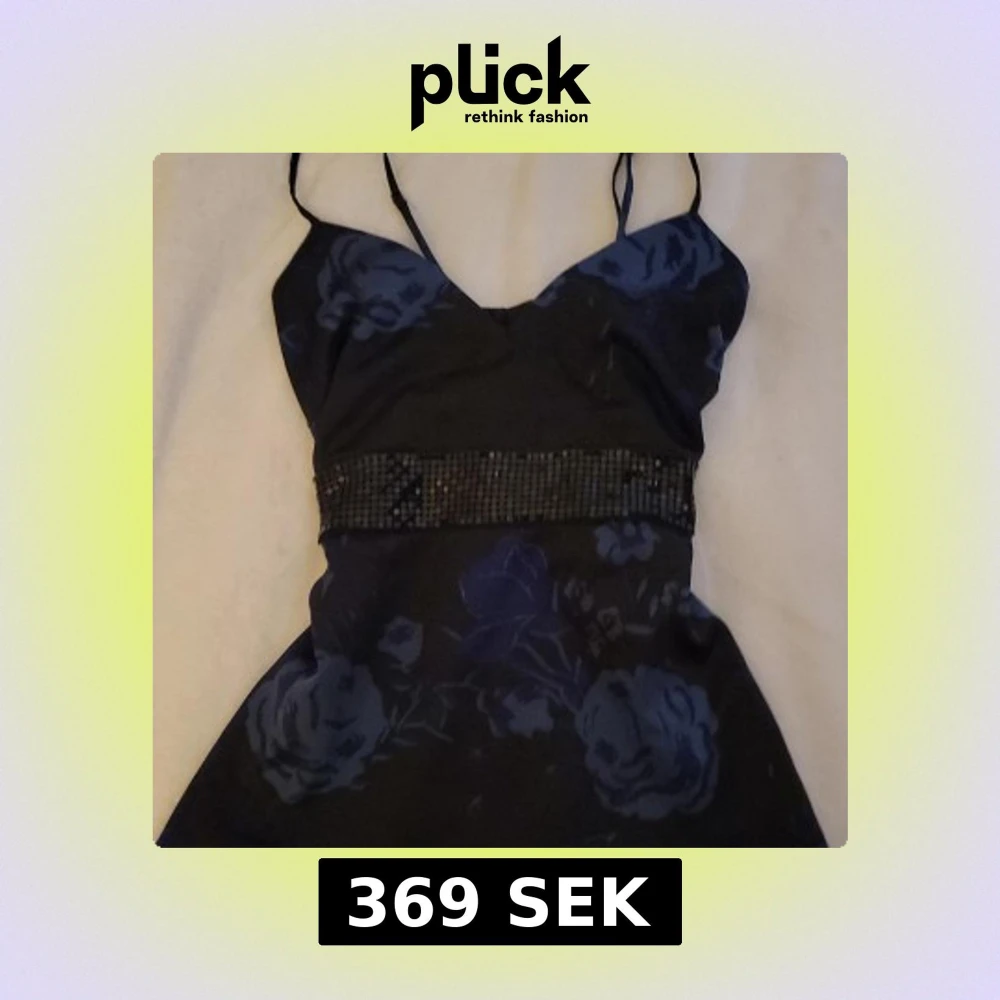 Supersnygg svart top med blåa blommor och smala axelband. Helt slutsåld och skulle se som vintage! Midjan har ett brett band med svarta paljetter som ger extra bling. Toppen har en feminin passform, perfekt för dig som vill sticka ut med en cool och elegant look. Passar xs/s