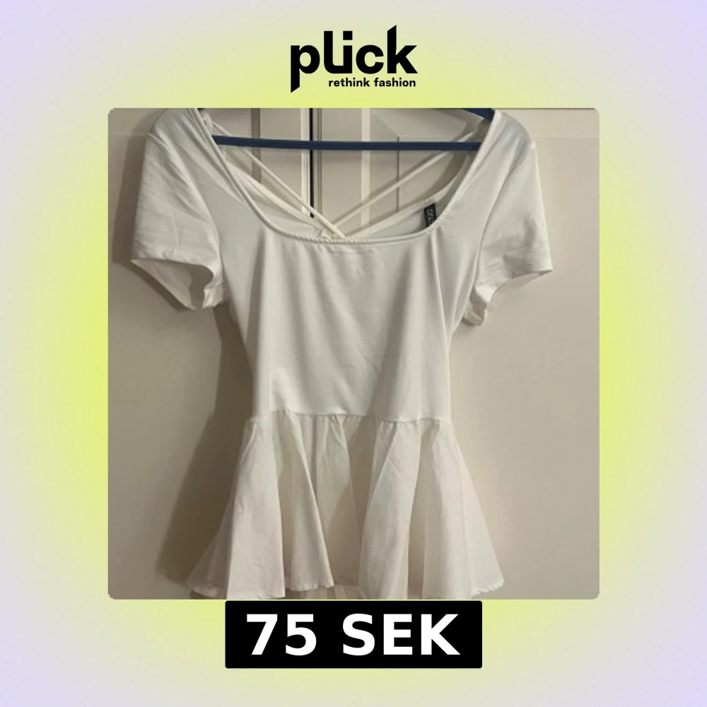 Supersöt vit peplumtop från Divided med omlott och snörning i ryggen. Toppen har korta ärmar, v-ringad hals och volang nedtill. Aldrig använd.