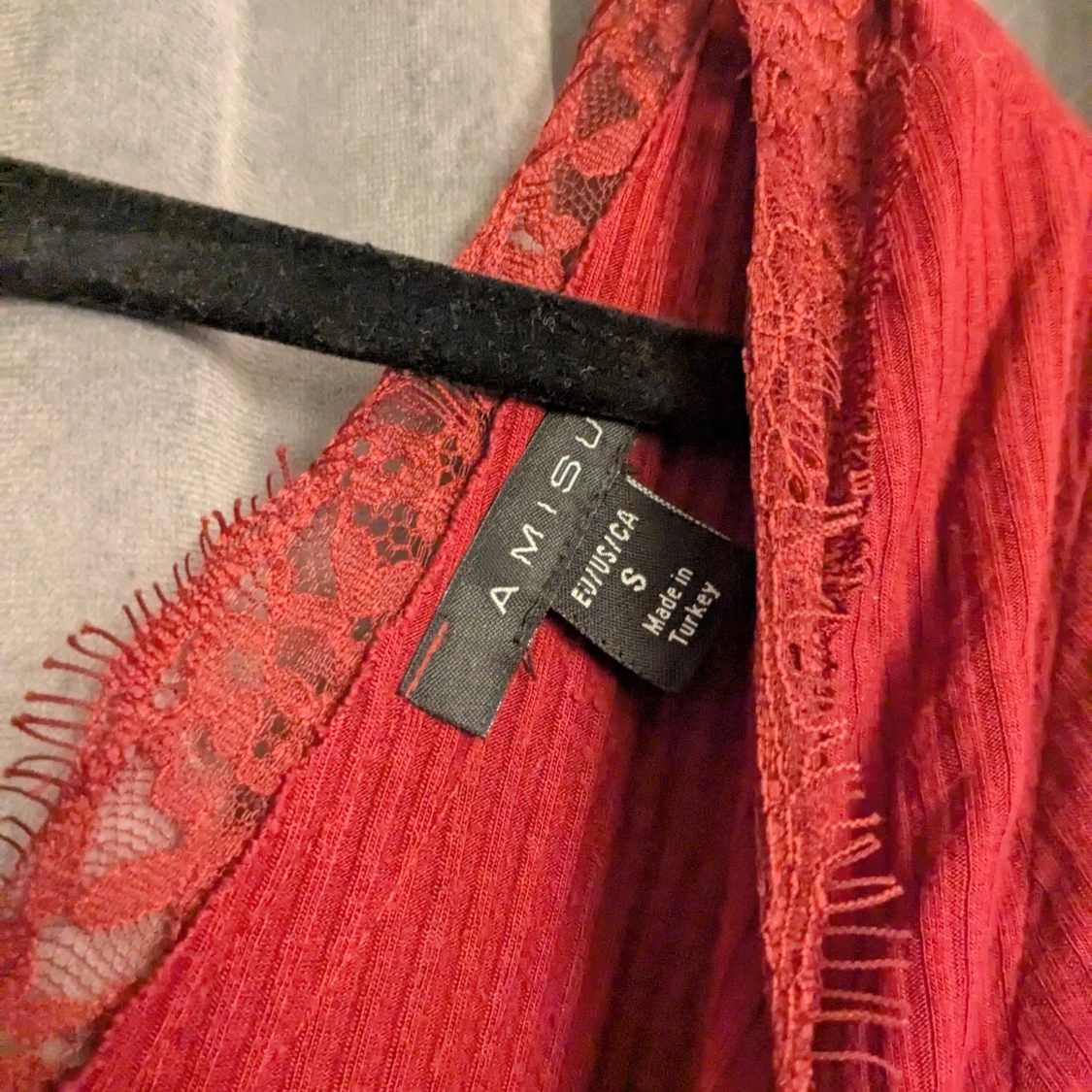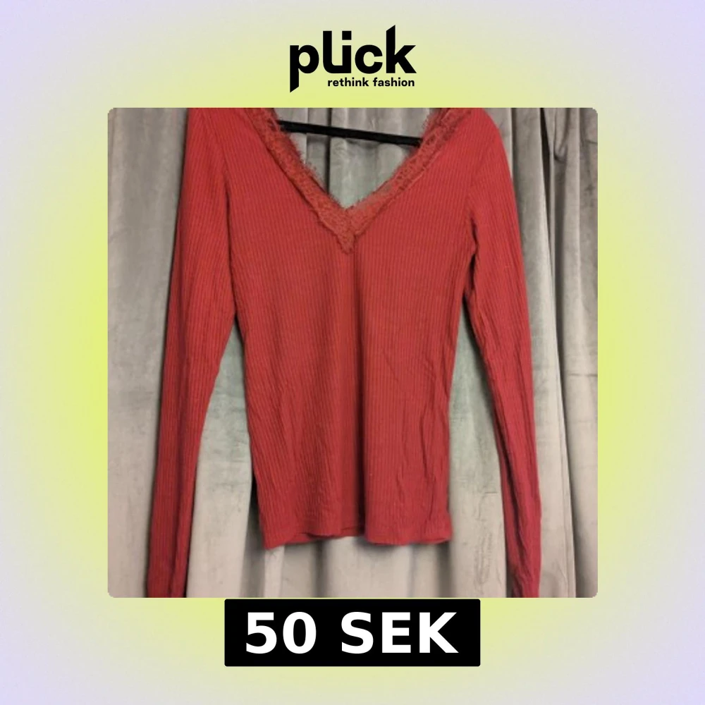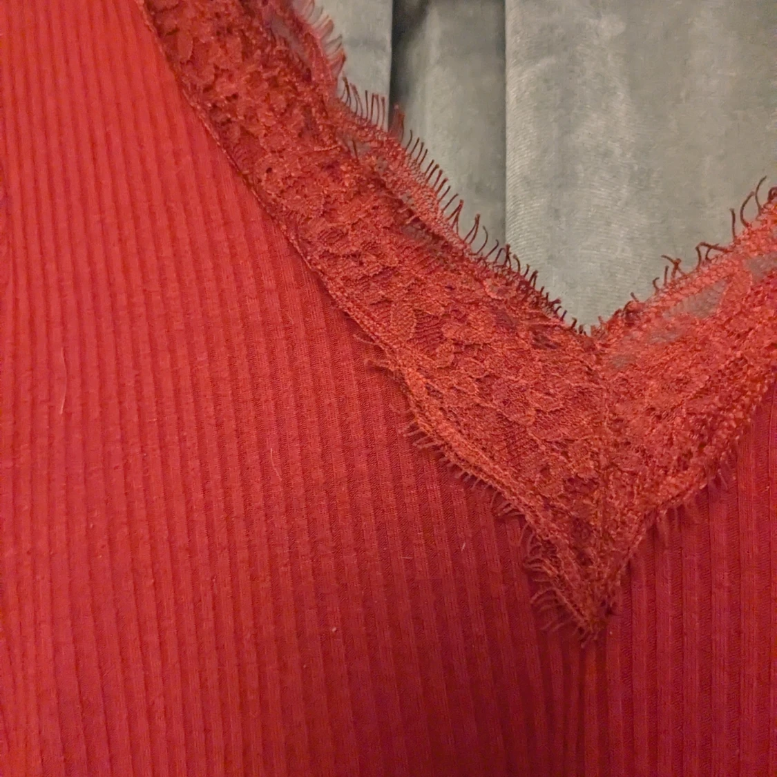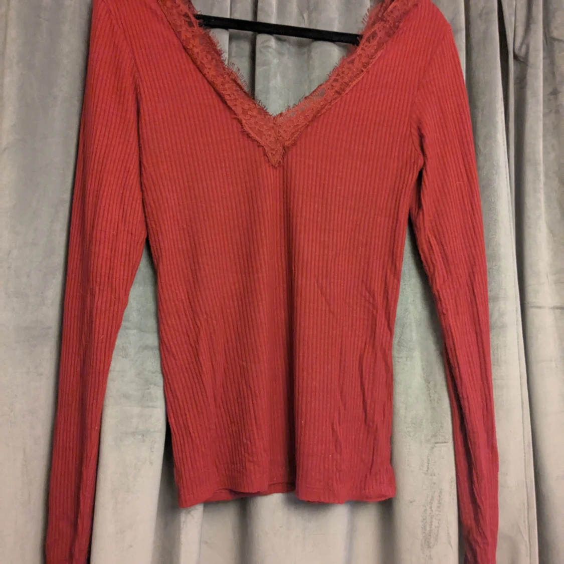 Säljer en röd långärmad topp från Amisu med ribbad struktur och snygg v-ringning med spets. Använd sparsamt!🫶🏻