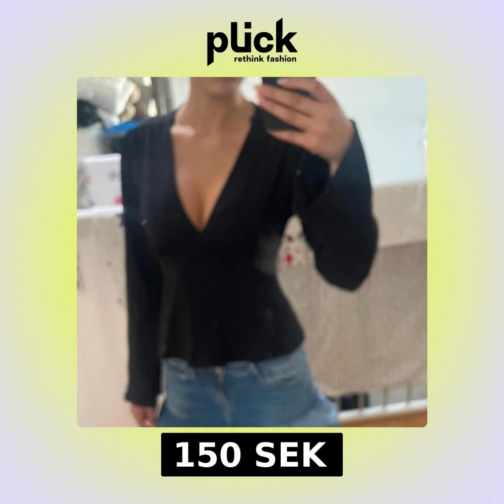 Säljer en tröja med djup v-ringning och långa ärmar. Toppen har en snygg knytrosett i midjan som ger en feminin siluett. Perfekt att styla med jeans eller kjol för en trendig look. Fråga Gina
