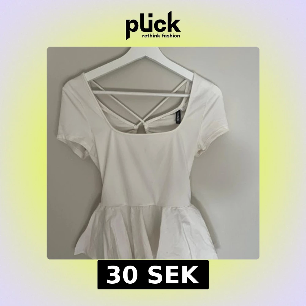 Superfin vit peplumtop från H&M Divided med korta ärmar och snygg snörning i ryggen. Toppen har en öppen rygg med knyt och criss-cross-detaljer, samt en volangig nederdel. Perfekt för dig som gillar trendiga och feminina plagg.