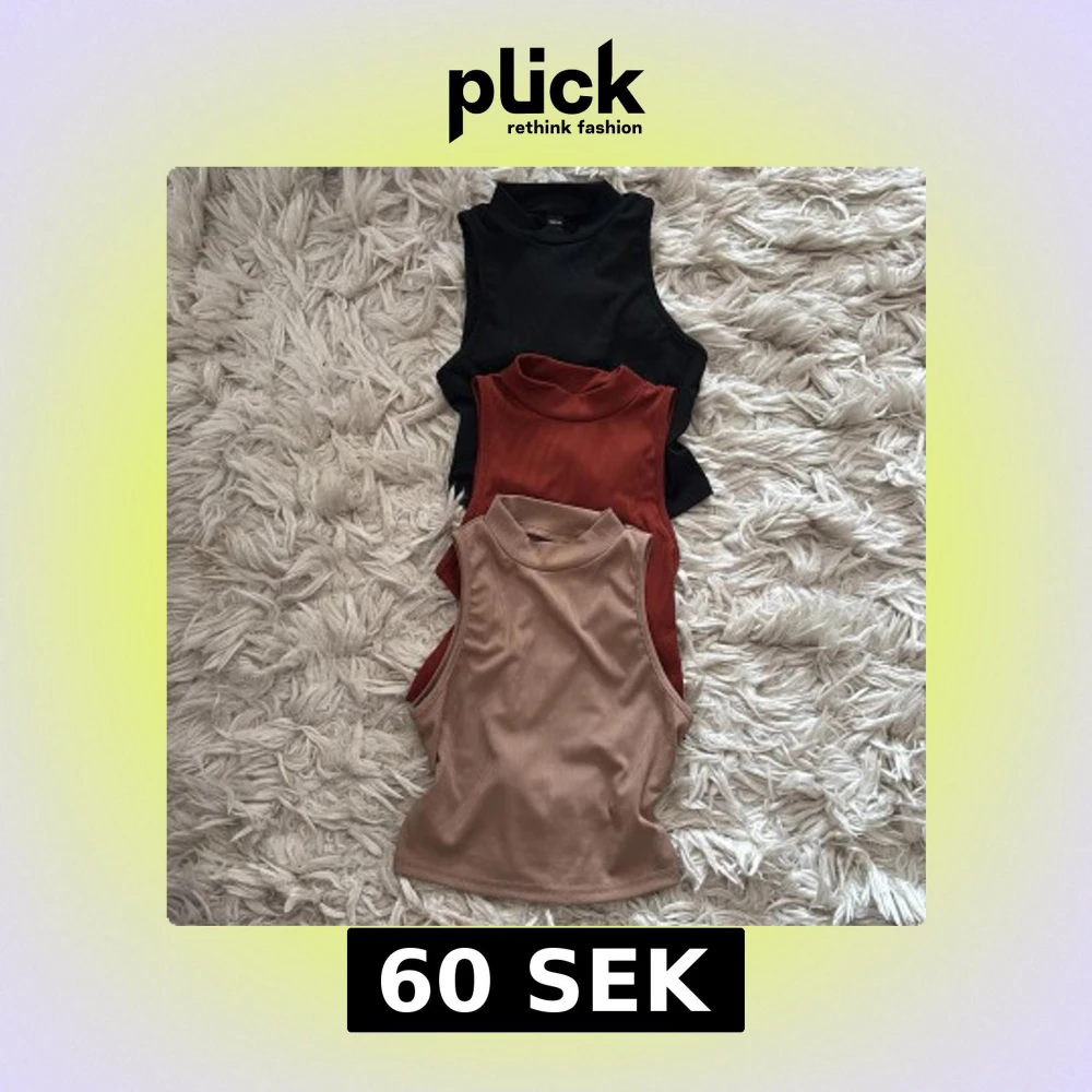 Säljer tre croppade linne-toppar från Shein i ribbat material. Färgerna är svart, rostbrun och beige. Alla har hög hals och är ärmlösa, perfekta att styla med jeans eller kjol. Snygga basplagg med tight passform och stilren look.