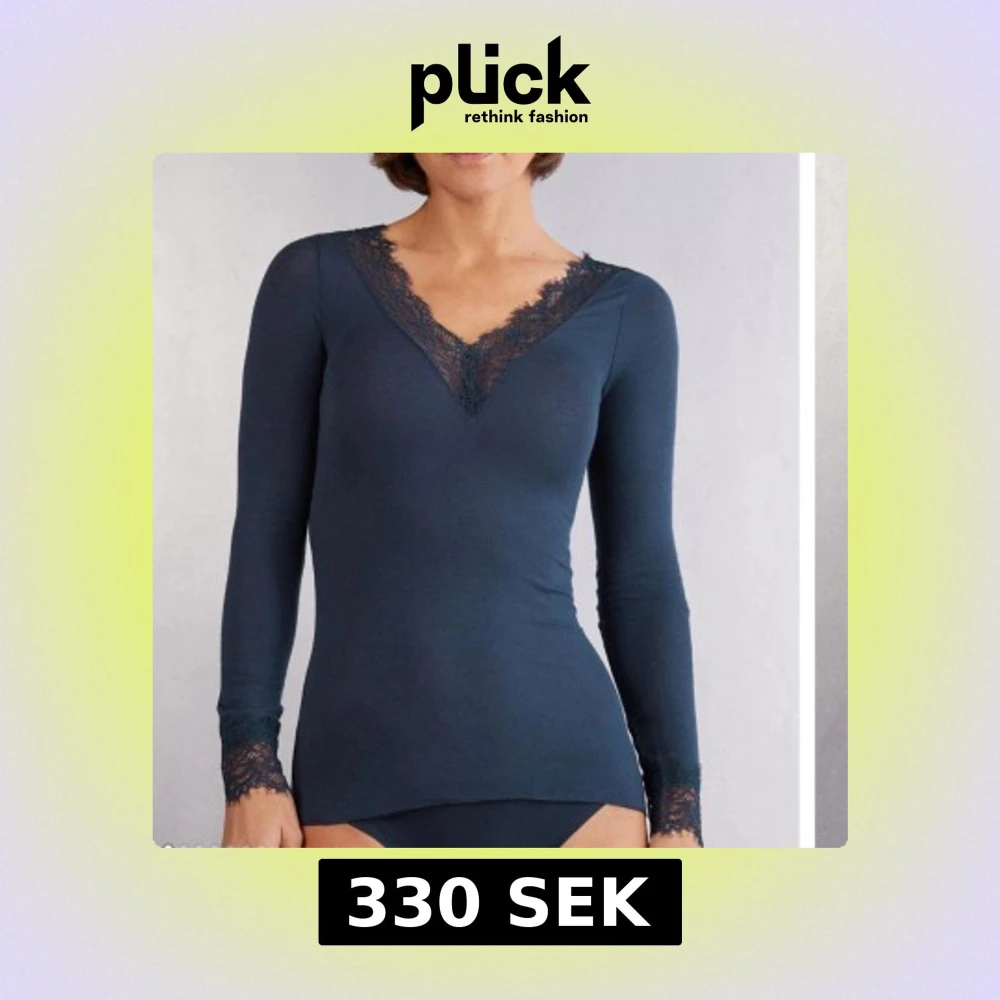 Elegant mörkblå topp med långa ärmar och v-ringad spetsdetalj vid halsringningen!