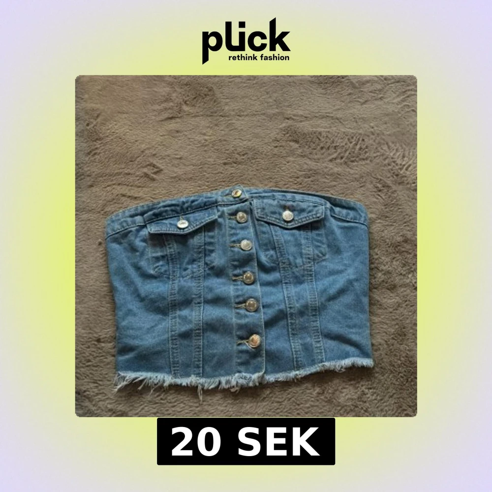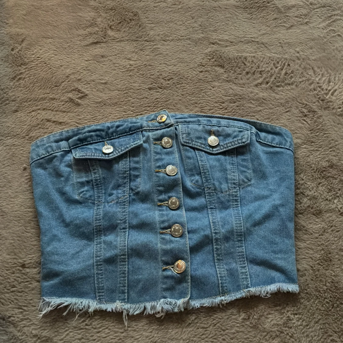 Säljer en snygg jeans tubtopp med knappar framtill, två fejkade bröstfickor och fransad nederkant. Baksidan har smock för extra stretch och passform. Perfekt för dig som gillar denim och vill ha en cool, edgy look. Storlek S. Knappt använd, skicket är som nytt