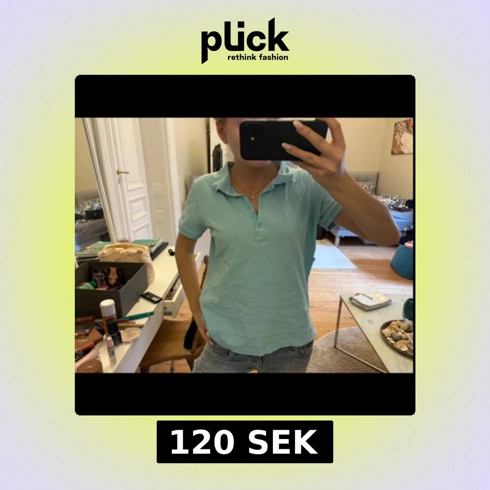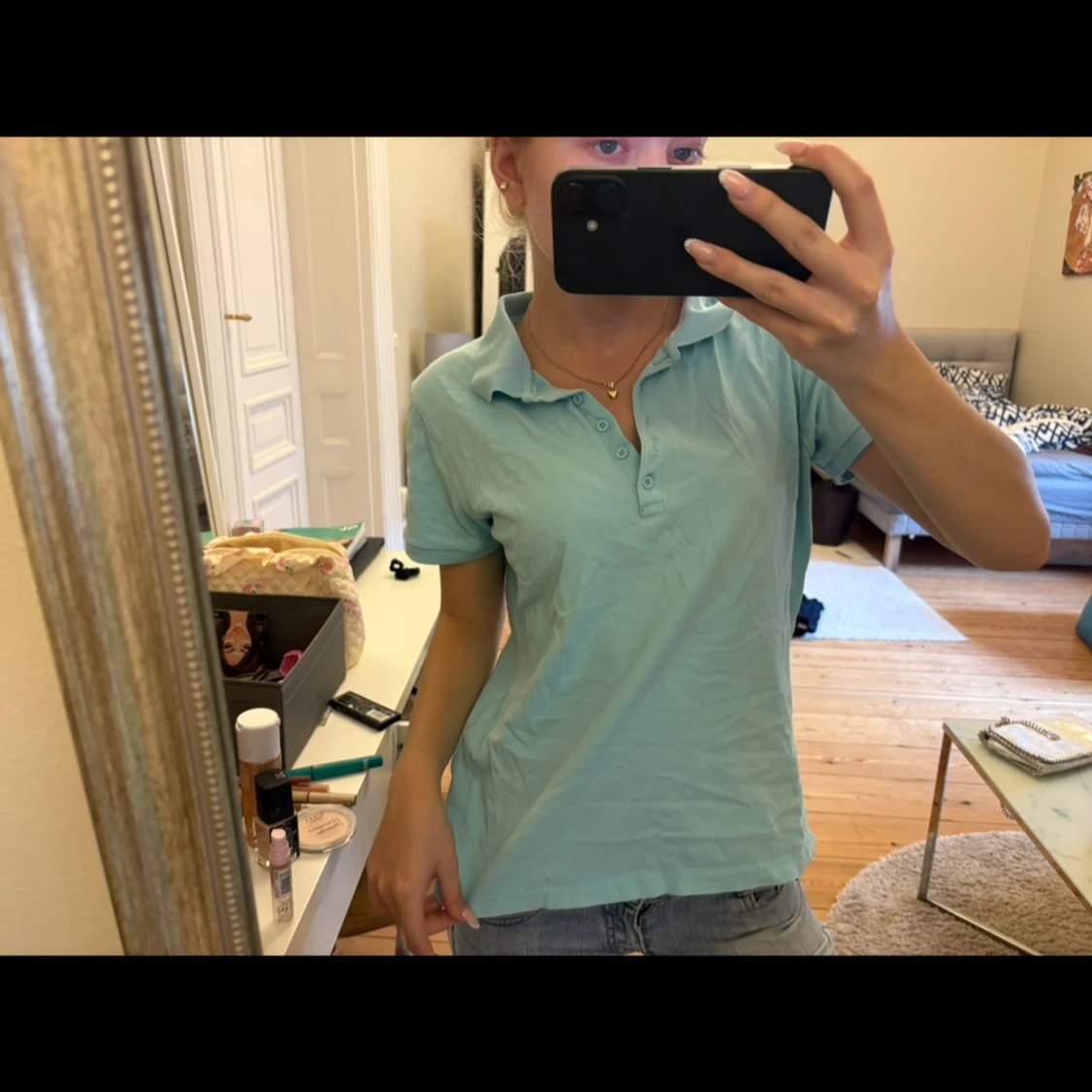 Säljer en ljusblå piké topp med klassisk krage och knappslå framtill. T-shirten har korta ärmar och är gjord i mjuk bomull, perfekt för en chill och sportig look. Enkel att matcha med jeans eller shorts.🩵