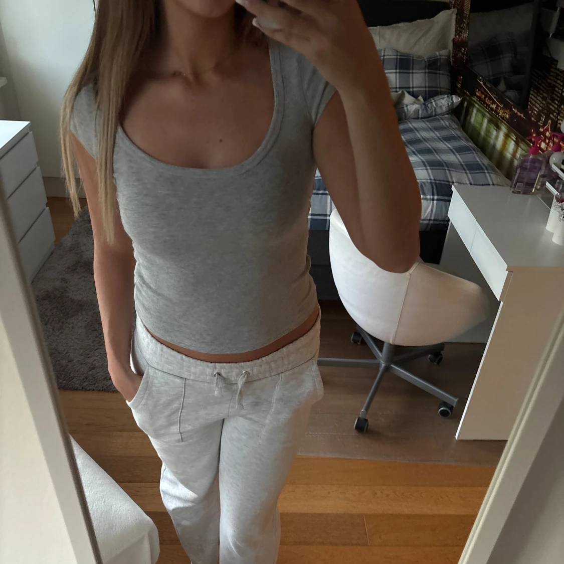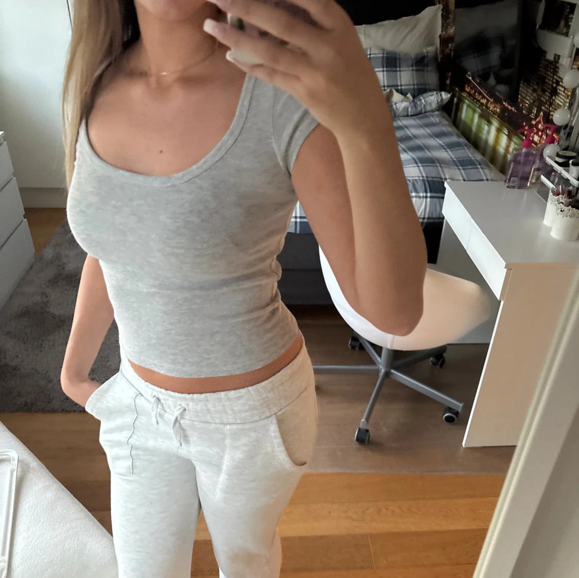Säljer en enkel och stilren ljusgrå croppad t-shirt med rund halsringning och korta ärmar. Toppen är figurnära och passar perfekt till ett par mjukisbyxor eller jeans. Supermjuk och skön att ha på sig.