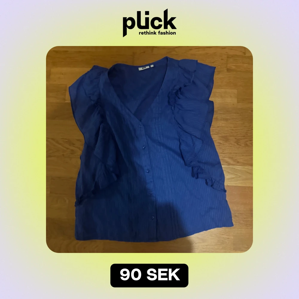 Säljer en snygg blå blus från WE i storlek S. Den har en v-ringad design med knappar framtill och volangdetaljer längs ärmarna. Perfekt för både vardag och fest!