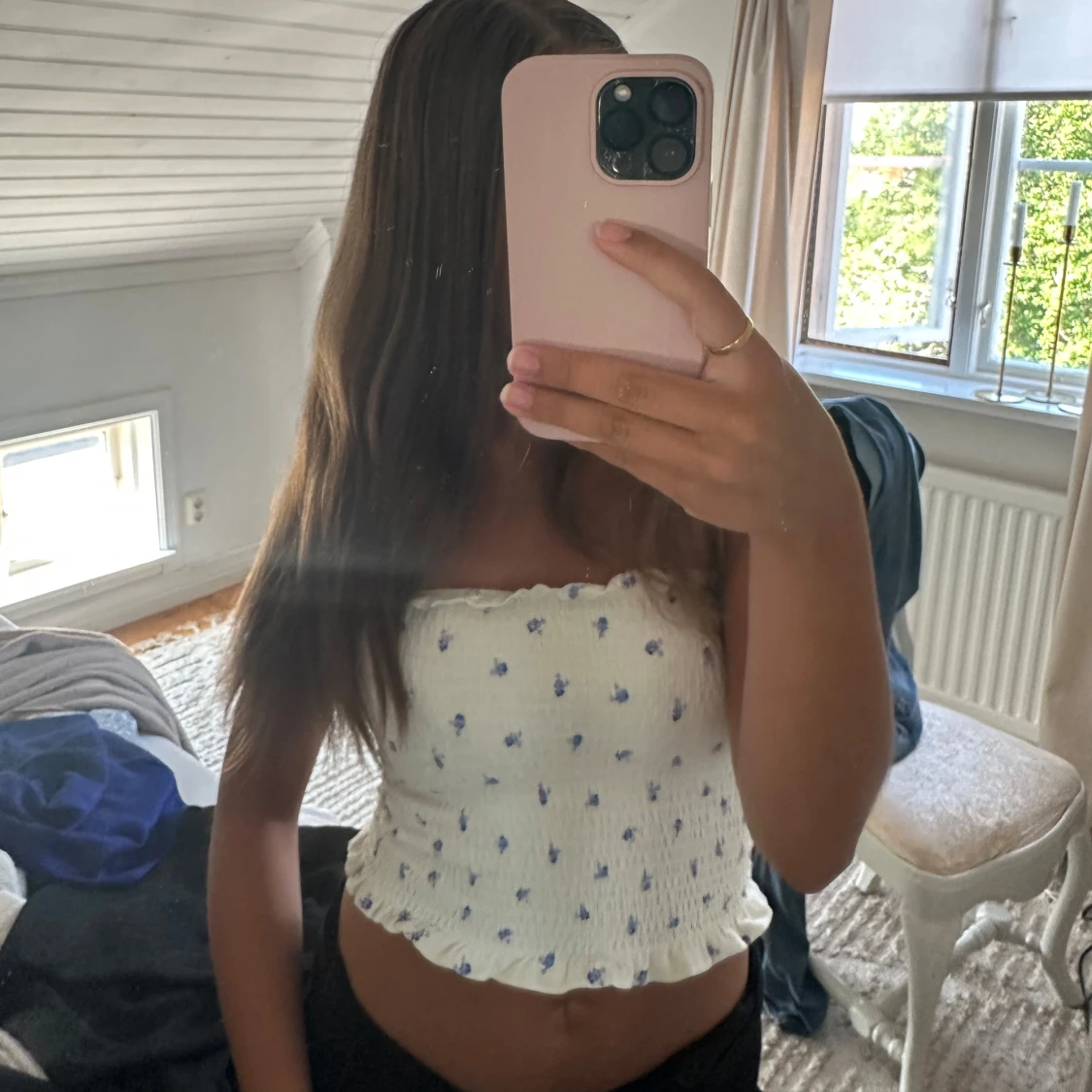 Supersöt vit bandeau tubtopp med små blå blommor och volangkant nertill. Toppen är smockad och sitter tight mot kroppen, perfekt för varma dagar. Den är ärmlös och har en fräsch, somrig vibe.
