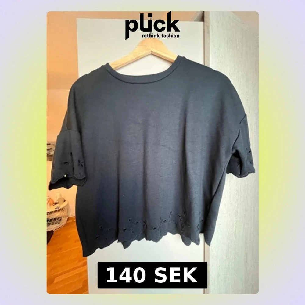 Mörkblå croppad topp från C&A med korta ärmar och broderade håldetaljer vid ärmslut och nederkant. Rund halsringning och loose passform, perfekt för en chill och stilren look.