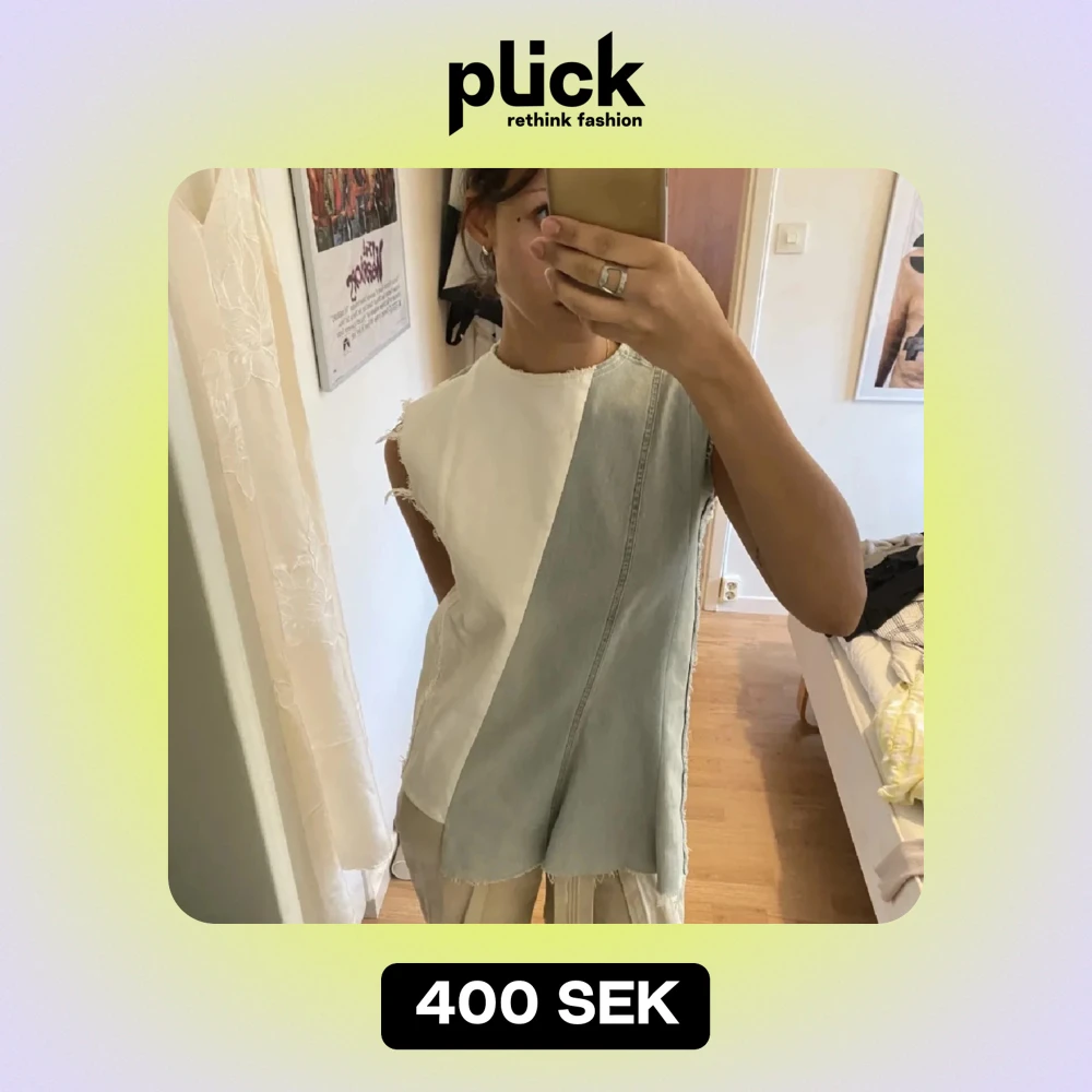 Säljer en unik ärmlös topp med en kombination av denim och vitt tyg. Toppen har råa kanter och en asymmetrisk design som ger en cool och avslappnad look. Perfekt för en trendig stil.