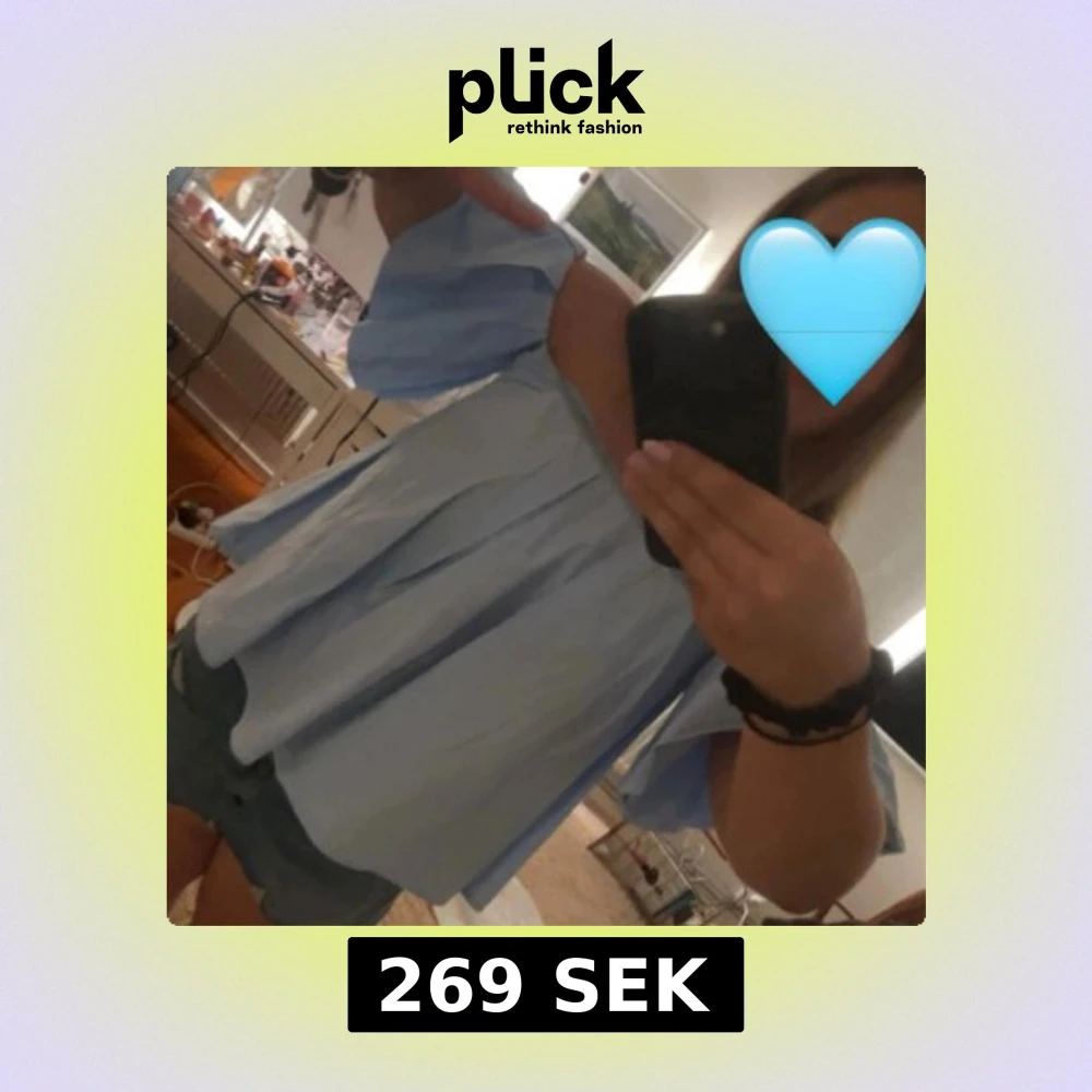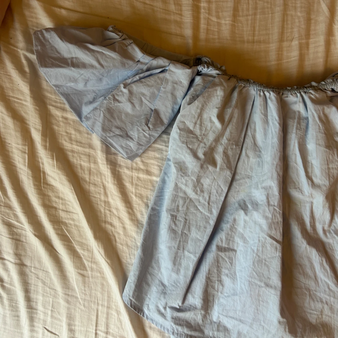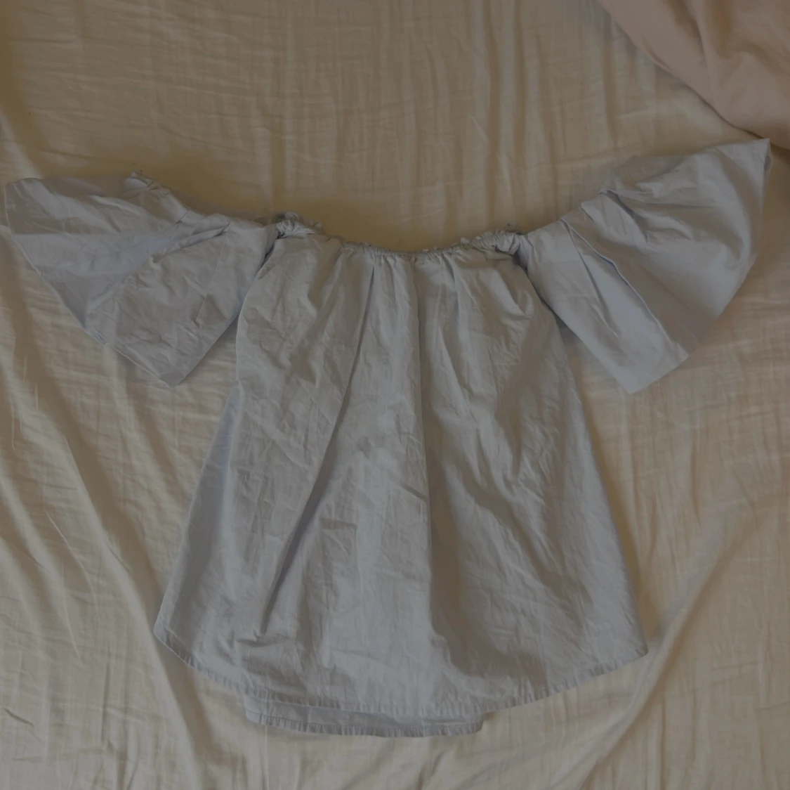 Säljer en ljusblå blus med offshoulder-modell och vida, korta ärmar. Toppen har en lös passform och är gjord i ett tunt bomullstyg som känns luftigt och skönt. Perfekt för varma dagar när du vill ha en chill och trendig look. Passar flera storlekar.