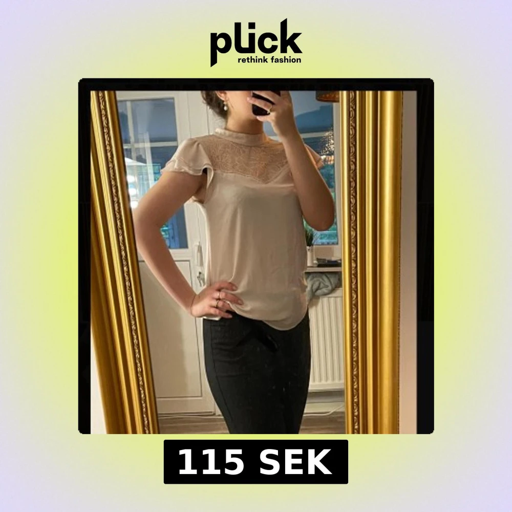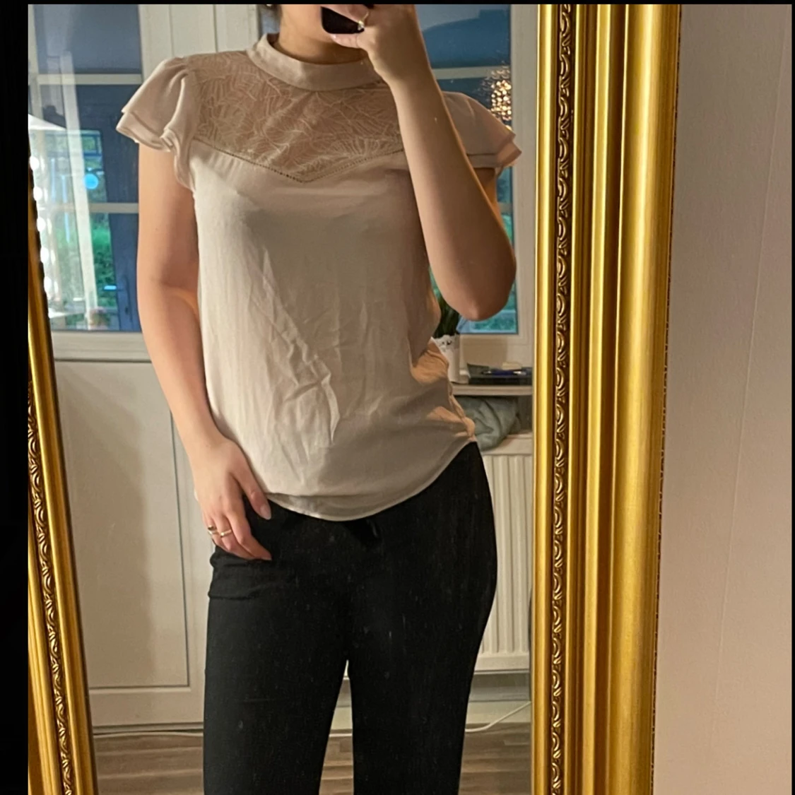 Säljer en beige blus med korta ärmar och hög hals. Överdelen har en snygg spetsdetalj. Blusen är lätt och har en mjuk, flowy passform.