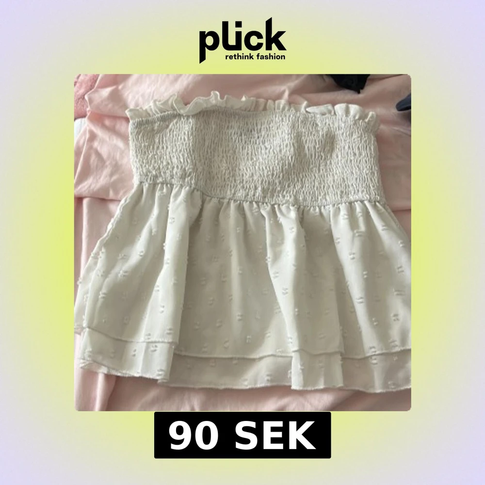Supersöt vit bandeau tubtopp från SHEIN med volangkant upptill och smockad överdel. Toppen har ett skirt lager med små broderade prickar och är helt axelbandslös. Perfekt för sommarens alla häng och selfies!