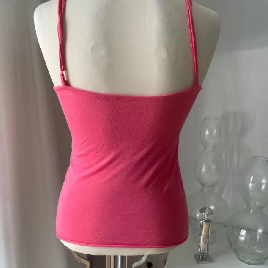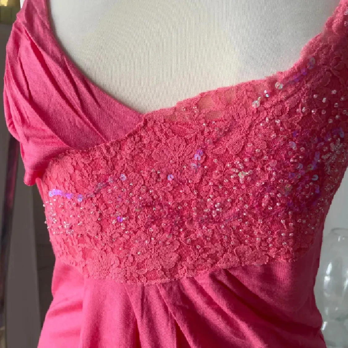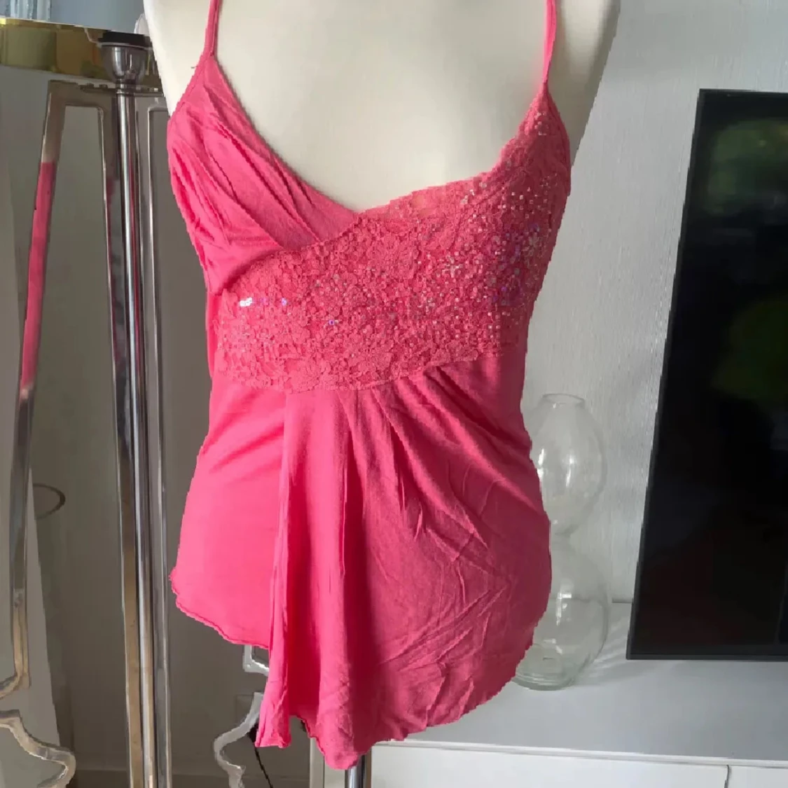 Snygg rosa linnetopp med smala axelband och croppad passform. Framsidan har ett brett parti med spets och glittrande paljetter som ger extra bling. Toppen är v-ringad och har en mjuk, flowy känsla i materialet. Perfekt för dig som gillar att sticka ut med detaljer.