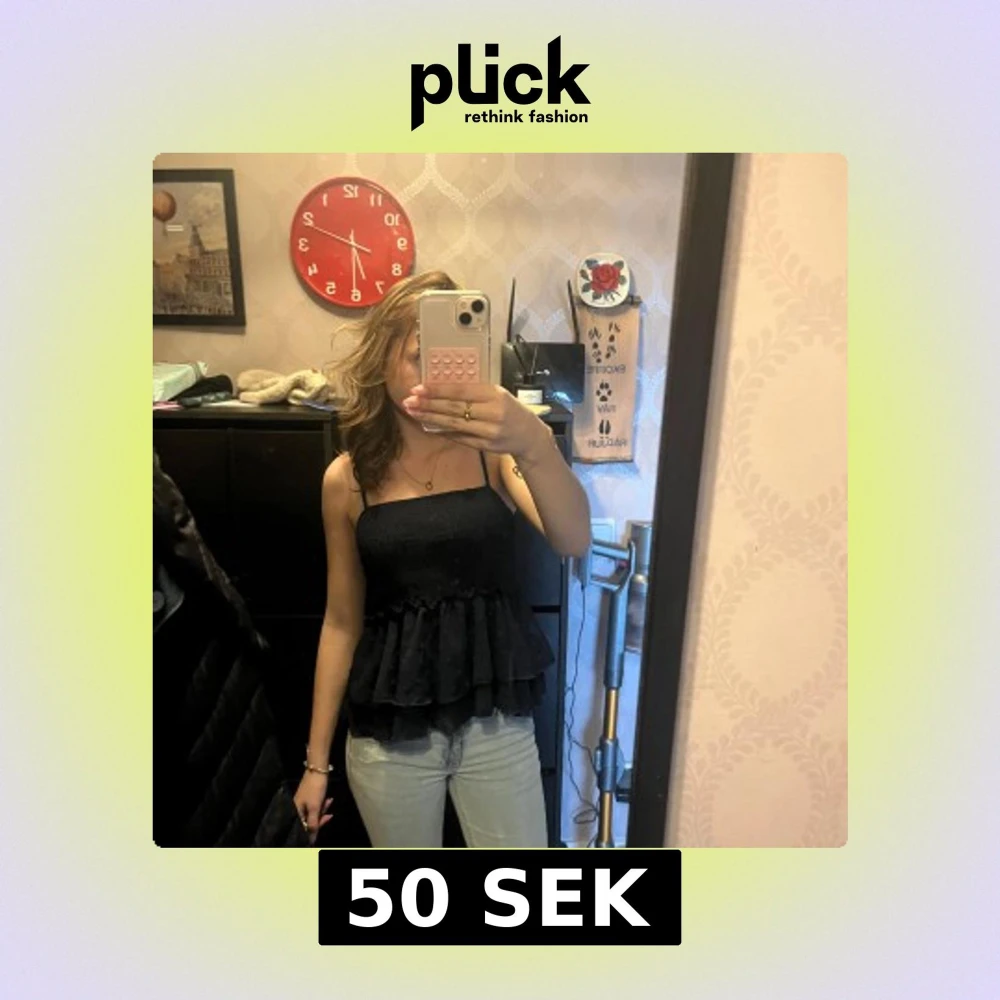 Säljer en stilren svart axelbandslös topp med volangdetaljer. Perfekt för en kväll ute eller en somrig dag. Toppen har en luftig passform och är lätt att matcha med olika outfits.