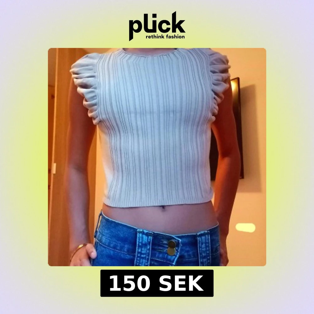 Säljer en beige ribbad topp med volangdetaljer på axlarna. Toppen är croppad och har en rund halsringning. Perfekt för dig som gillar en söt och trendig stil.