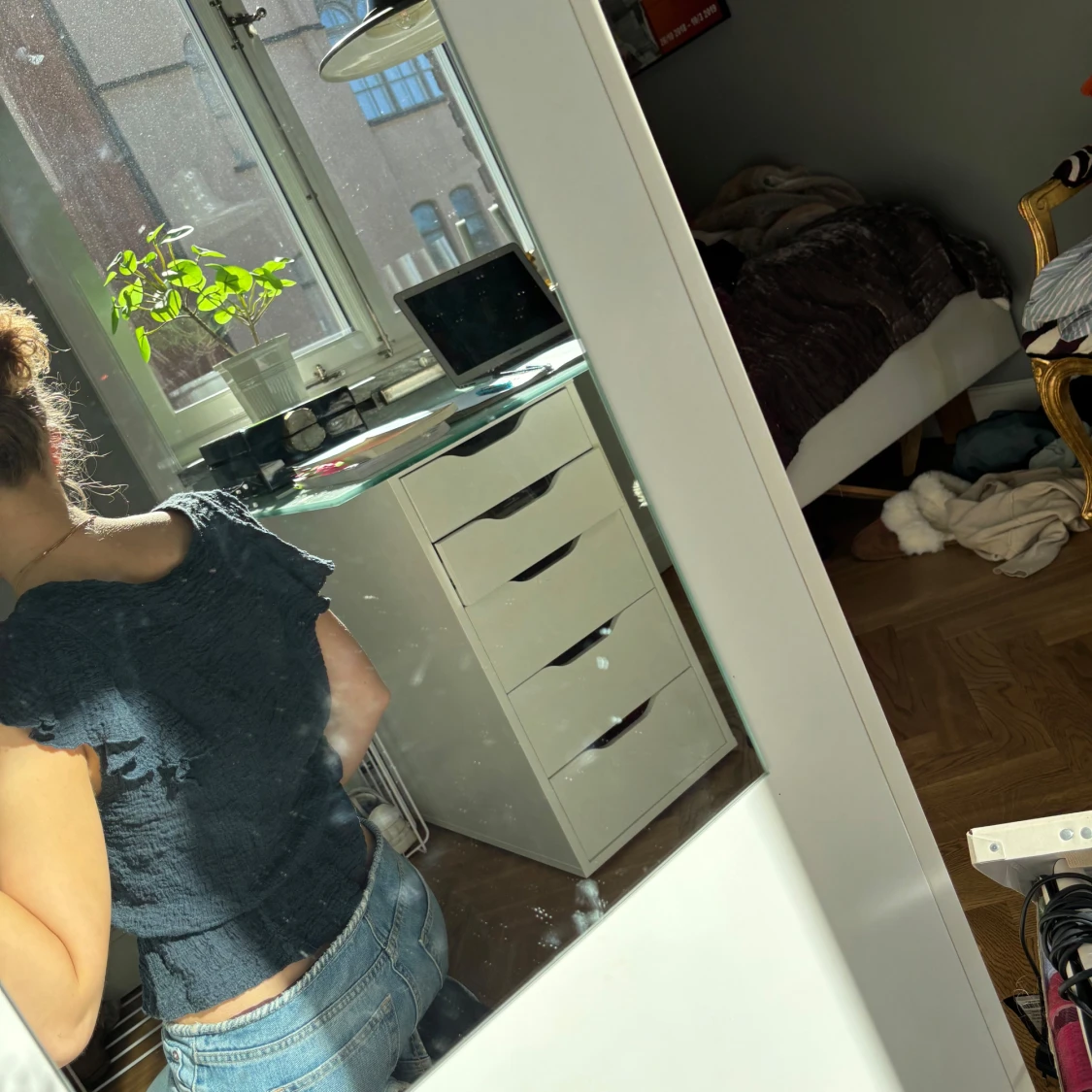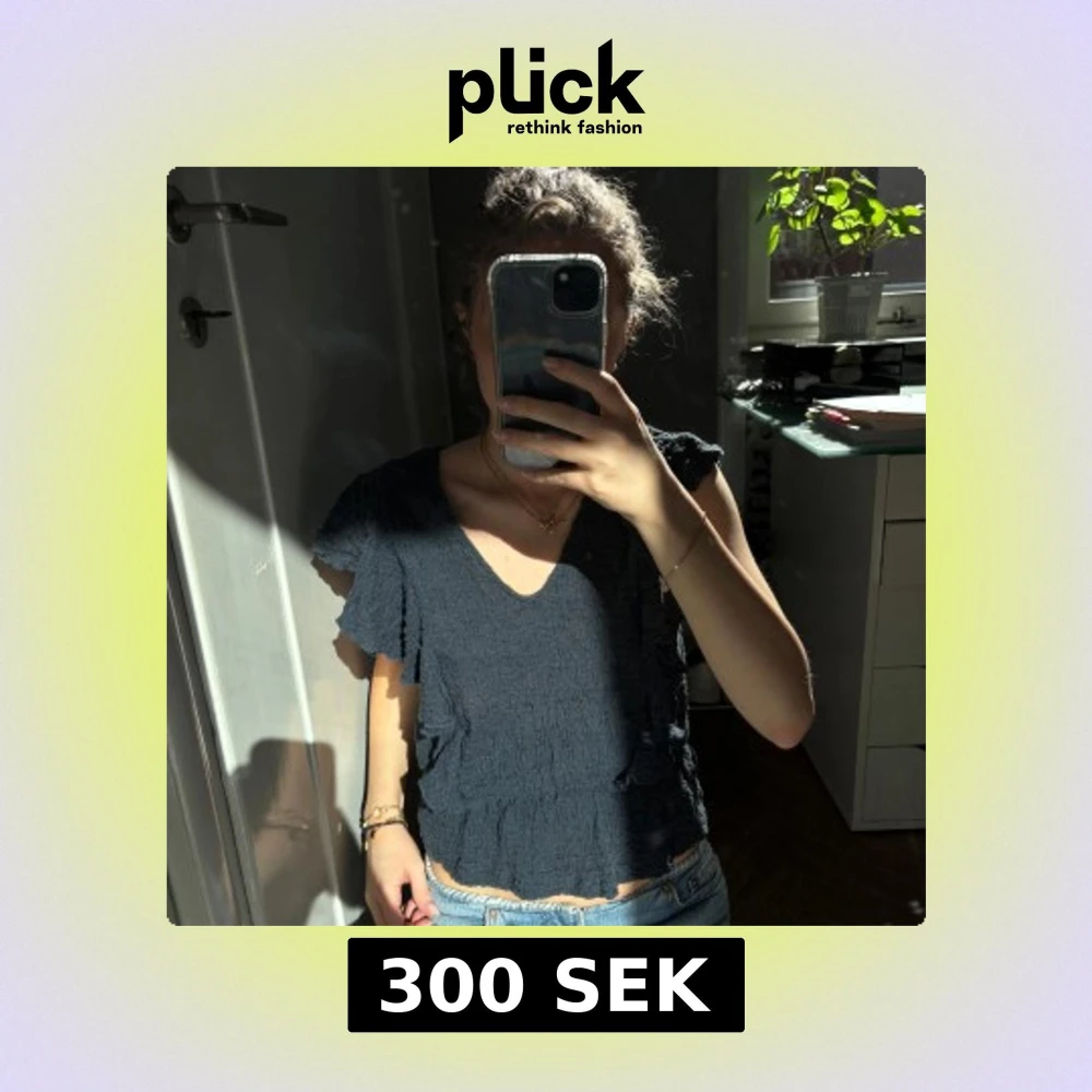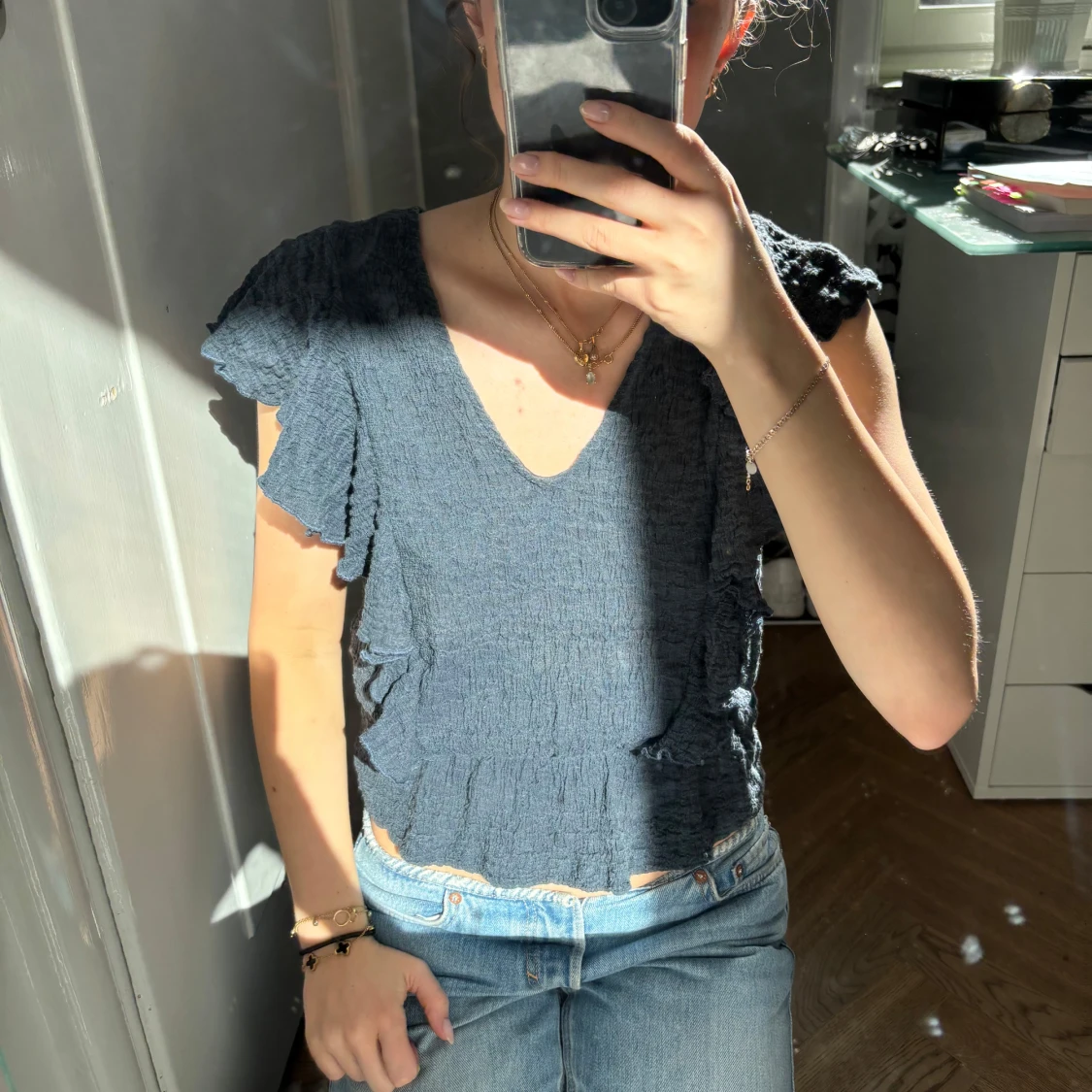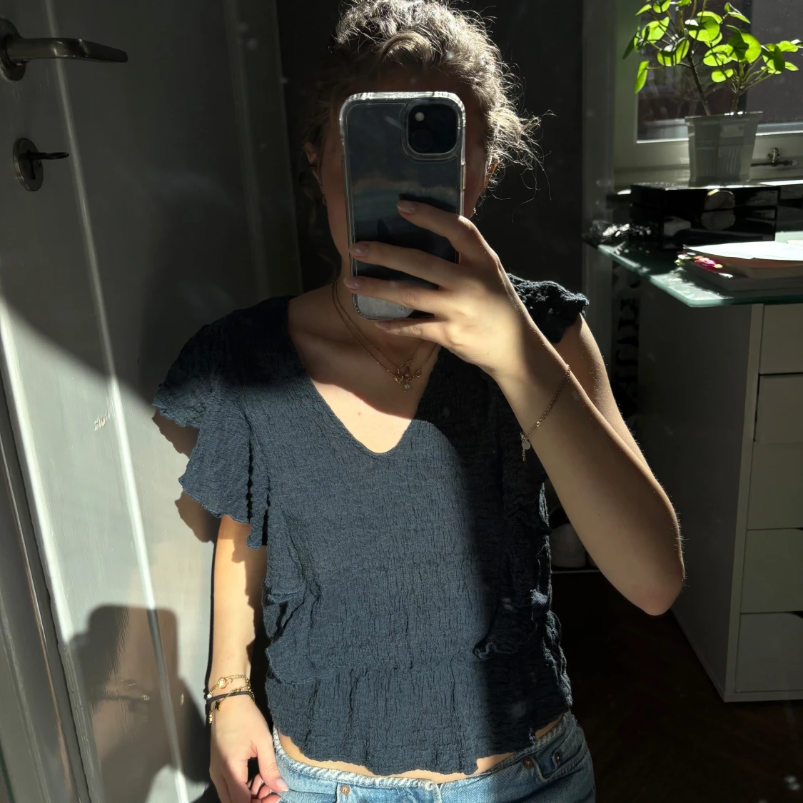 Säljer en svart v-ringad topp med korta ärmar och volangdetaljer. Toppen har en smockad design som ger en fin passform. Perfekt för en avslappnad stil.