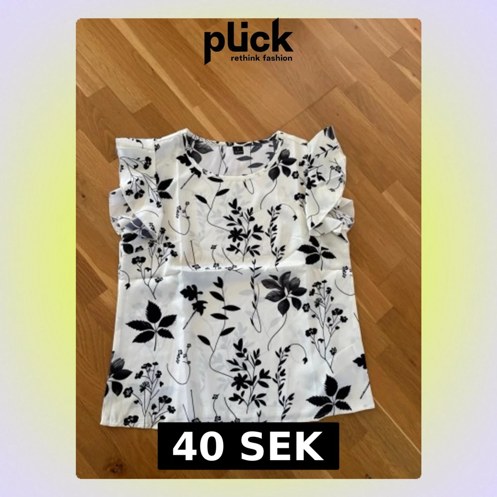 Härlig topp med ett vackert svartvitt blommönster och söta volangärmar. Lätt och luftig modell som passar perfekt till våren och sommaren.