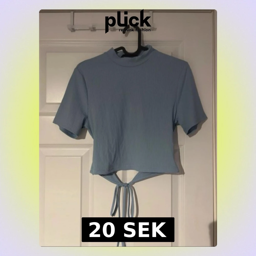 Ljusblå croppad topp med ribbad struktur och hög hals. Knytband i midjan som markerar figuren och en öppen rygg som ger en snygg och unik detalj. En stilren men samtidigt speciell topp – perfekt för fest, middag eller sommarhäng.(ifrån shein)