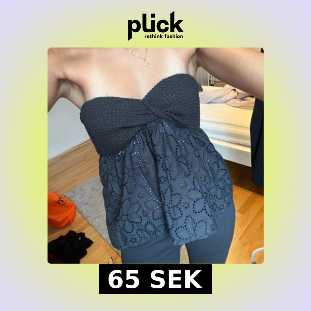 Supersöt svart bandeau tubtopp med virkad överdel och broderade blommor på den utsvängda delen. Toppen är axelbandslös och har en luftig, flowy passform. Perfekt för varma dagar när du vill ha något både bekvämt och snyggt.