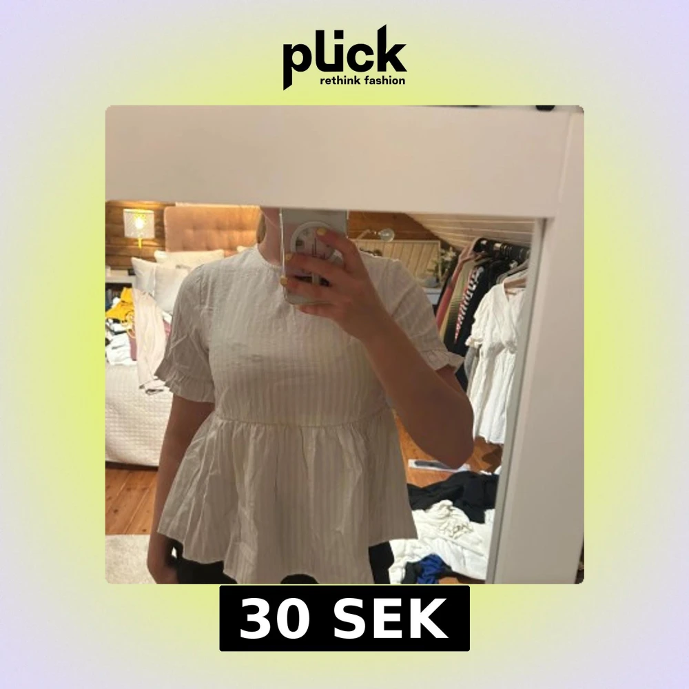 Supersöt vit blus från SHEIN med diskreta ränder och volang nedtill. Blusen har korta ärmar med liten volangkant och en lös, flowy passform. Perfekt för dig som gillar en romantisk och luftig stil. Toppen är köpt från Sellpy och har aldrig använts hos mig. Ganska liten i storlek så passar nog en xs bättre💞