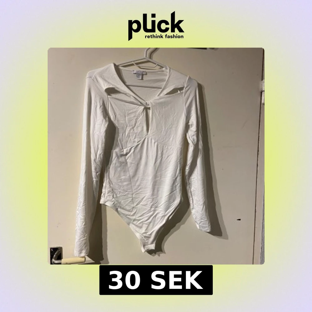Säljer en stilren vit långärmad bodysuit från Amisu. Den har en unik design med en liten knutdetalj framtill och en rundad hals. Perfekt för att skapa en chic look.