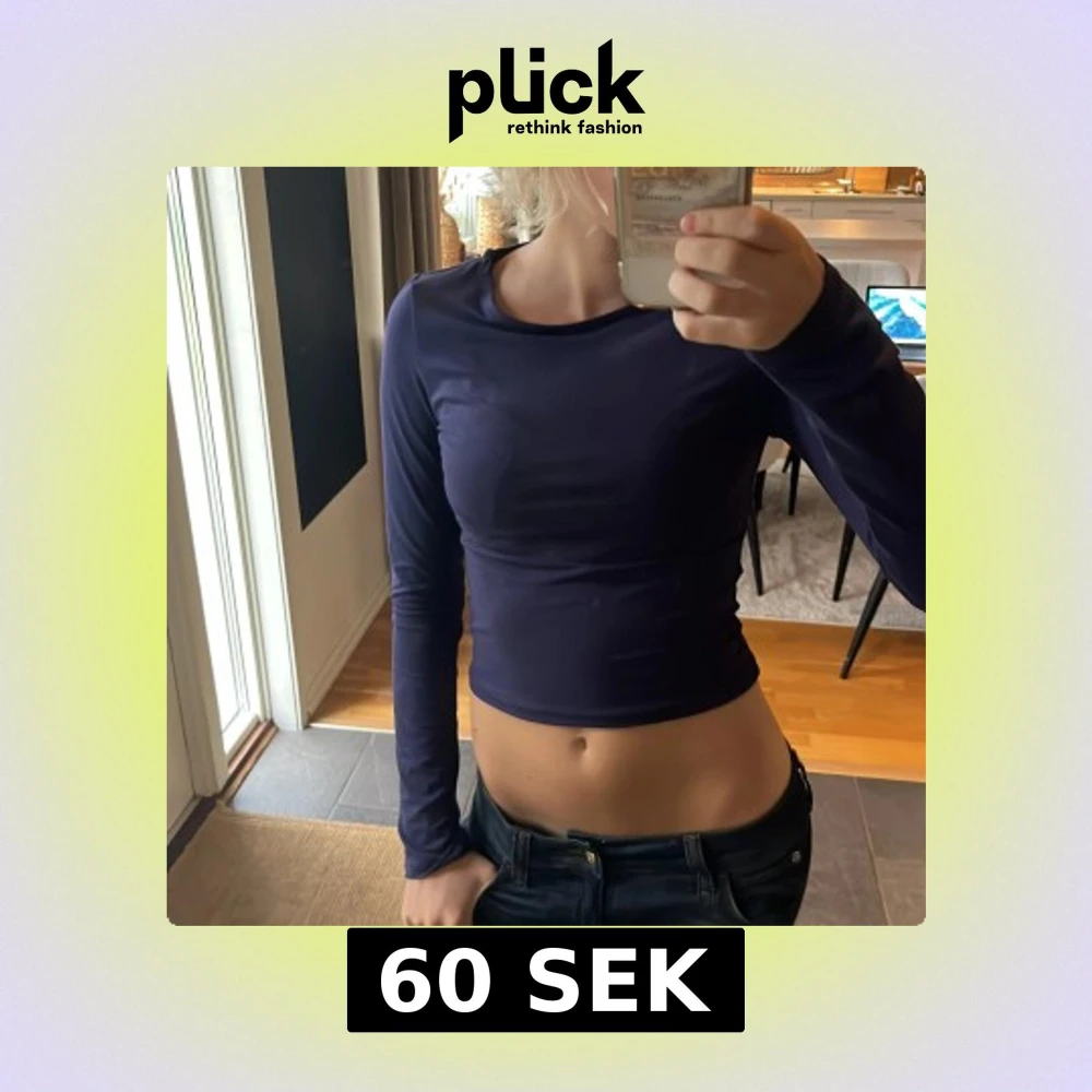 Säljer en mörkblå croppad topp med lång ärm och rund halsringning. Toppen har en tight passform och är tillverkad i ett stretchigt, mjukt material som sitter snyggt på kroppen. Använd fåtal gånger + är väldigt tjockt i materialet!