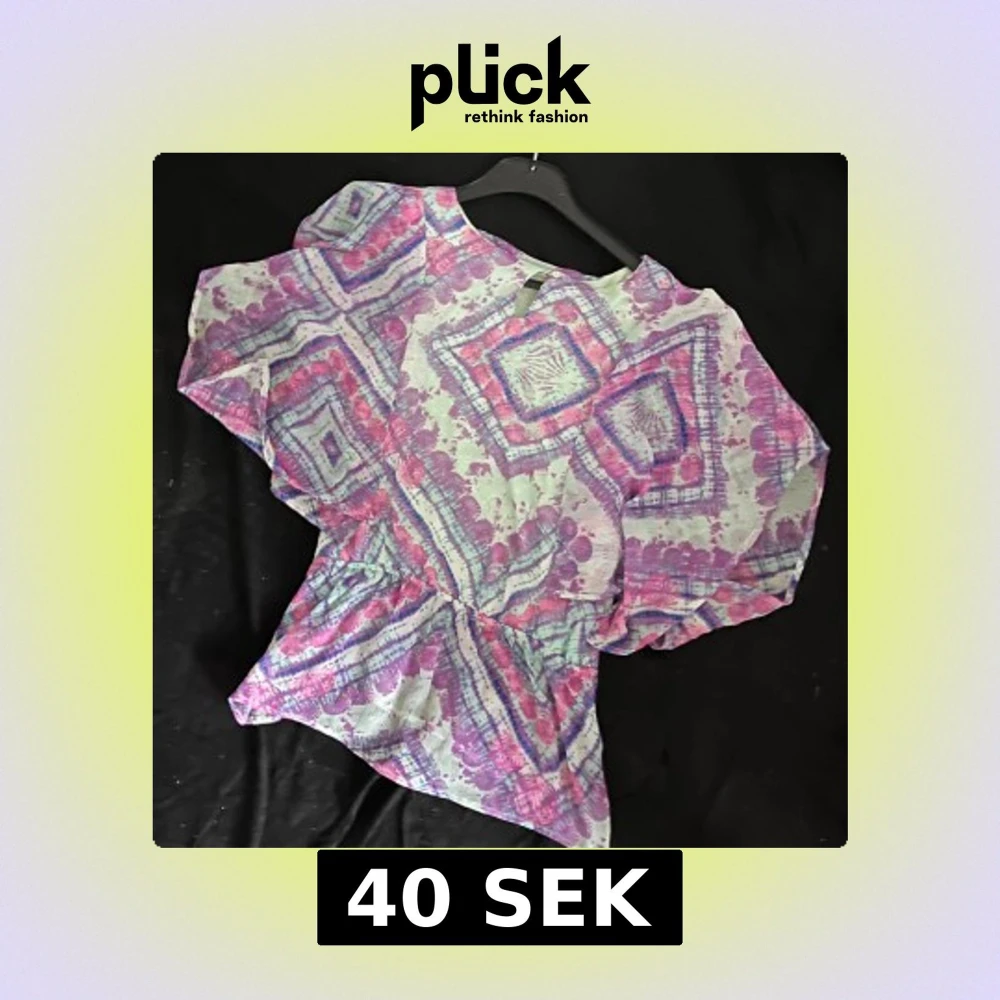 Säljer en luftig blus med vida ärmar och resår i midjan. Blusen har ett färgstarkt geometriskt mönster i lila, rosa och blått på ljus botten. Perfekt för dig som gillar boho-vibes och vill sticka ut med färg och form.