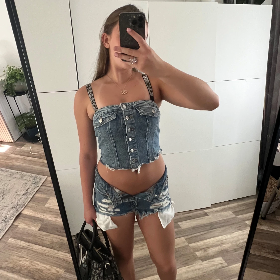 Ljusblå jeans topp som är helt oanvänd i storlek M men den är liten i storleken så den sitter som en XS eller S. Knapparna går att knäppa upp och knäppa igen.