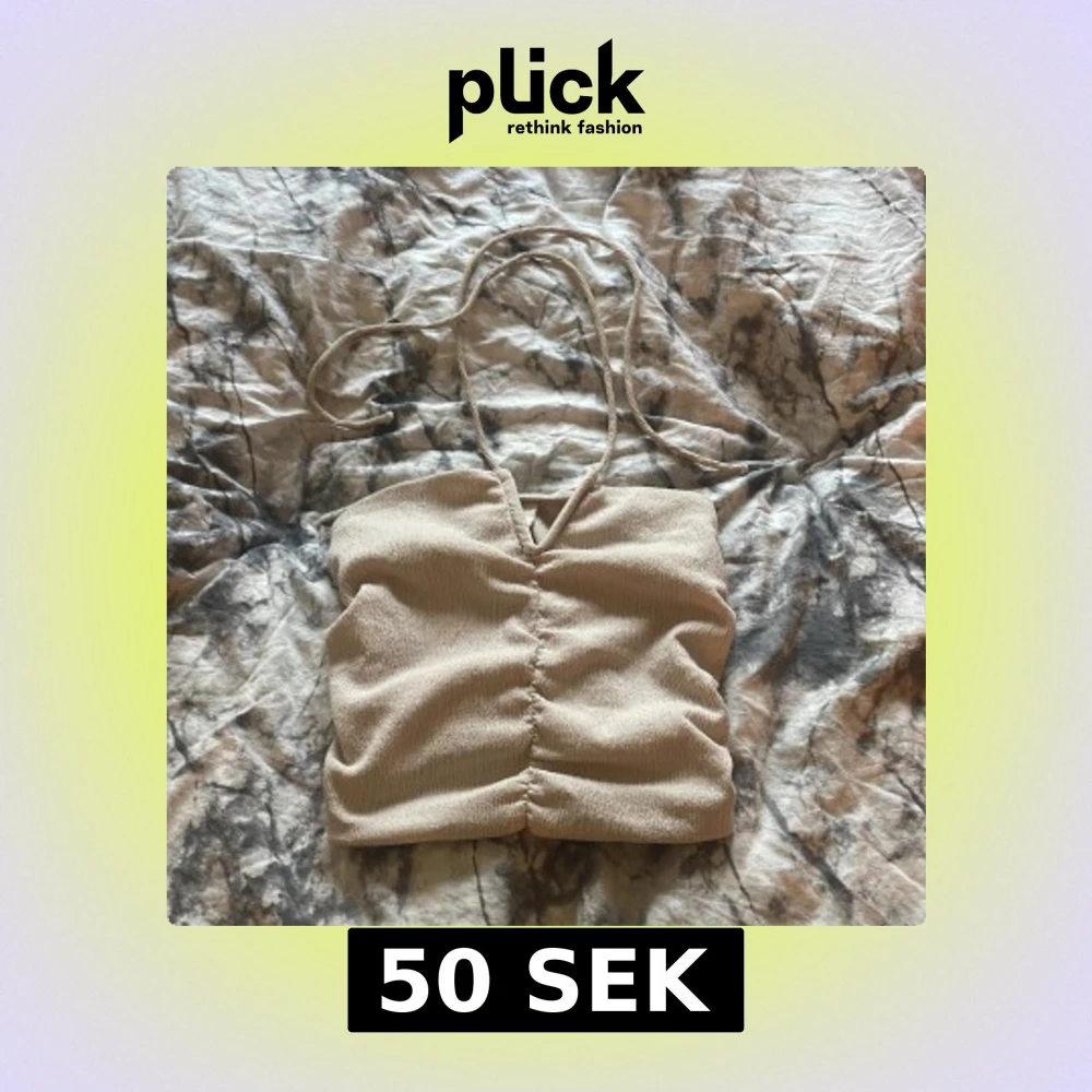 Säljer en beige croppad linnetopp med smala knytband och rynkdetalj framtill. Perfekt för varma dagar och enkel att styla med jeans eller kjol.