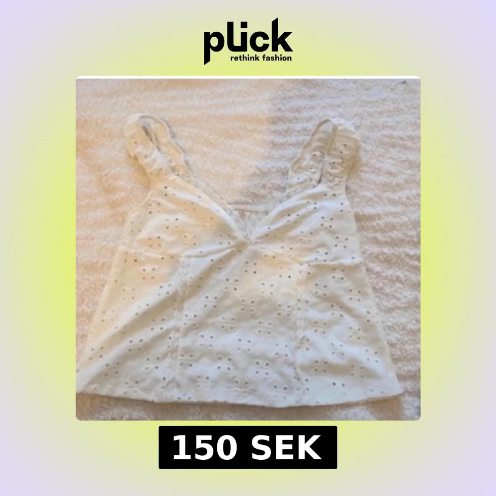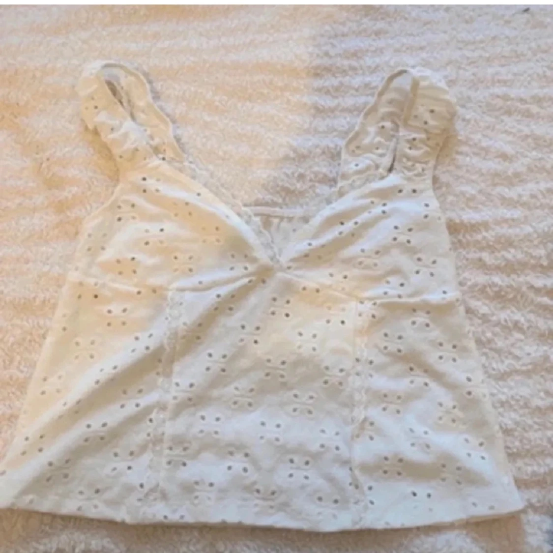 Säljer en söt vit ärmlös topp med spetsdetaljer och broderade hålmönster. Toppen har en v-ringad design och volangdetaljer vid axlarna. Perfekt för varma sommardagar! 🌼