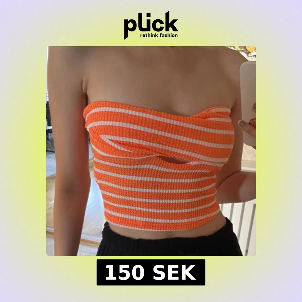 Säljer en orange och vit randig bandeau tubtopp med smockat tyg och en snygg cut-out detalj framtill. Toppen är axelbandslös och croppad, perfekt för sommarens varma dagar. Materialet är stretchigt och sitter tight mot kroppen.