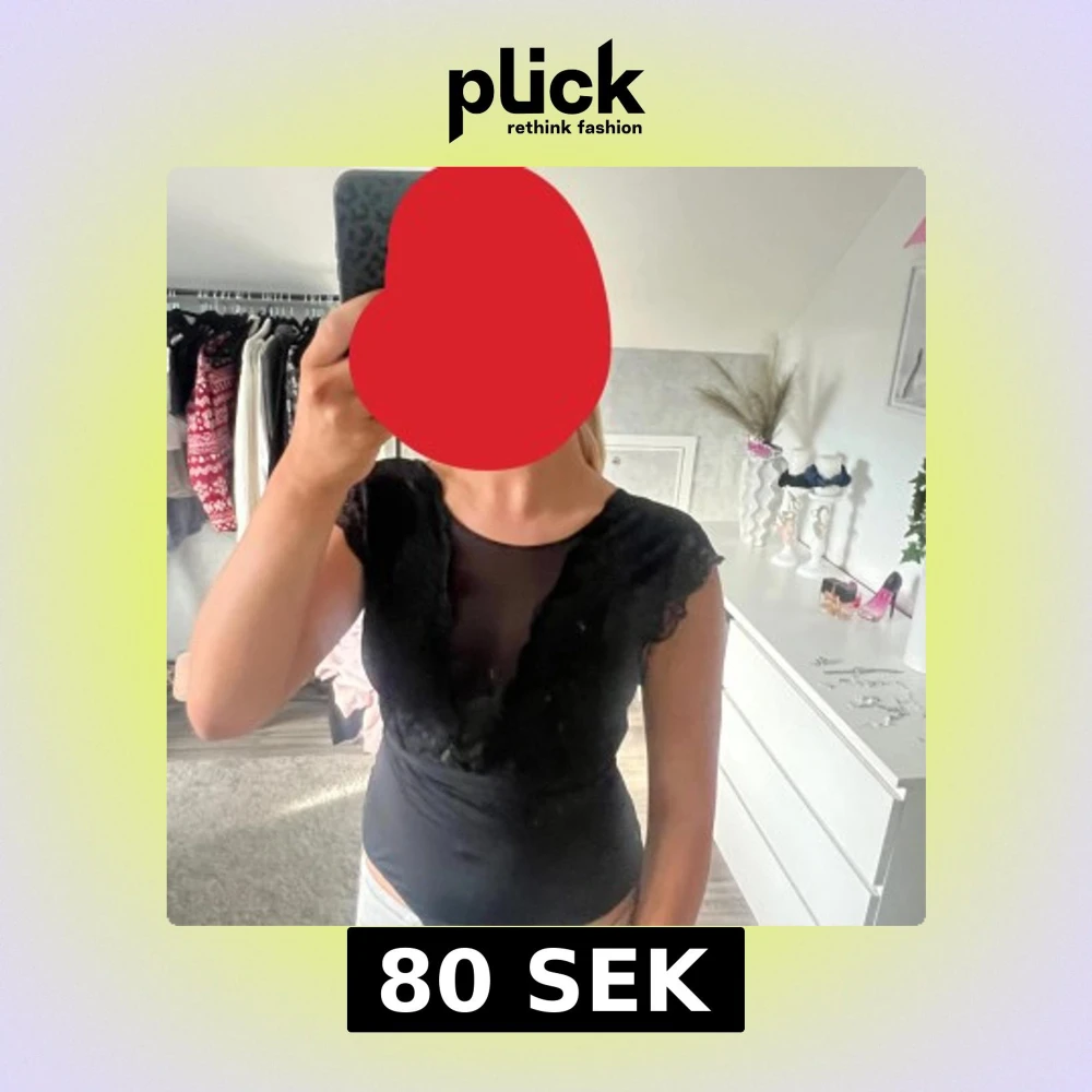 Säljer en svart body med djup v-ringning och mesh framtill. Toppen har spetsdetaljer längs urringningen och är ärmlös med små spetsärmar. Perfekt för dig som vill ha en snygg och trendig look.