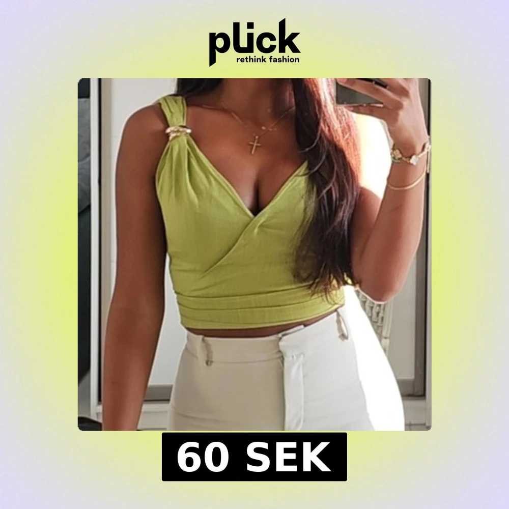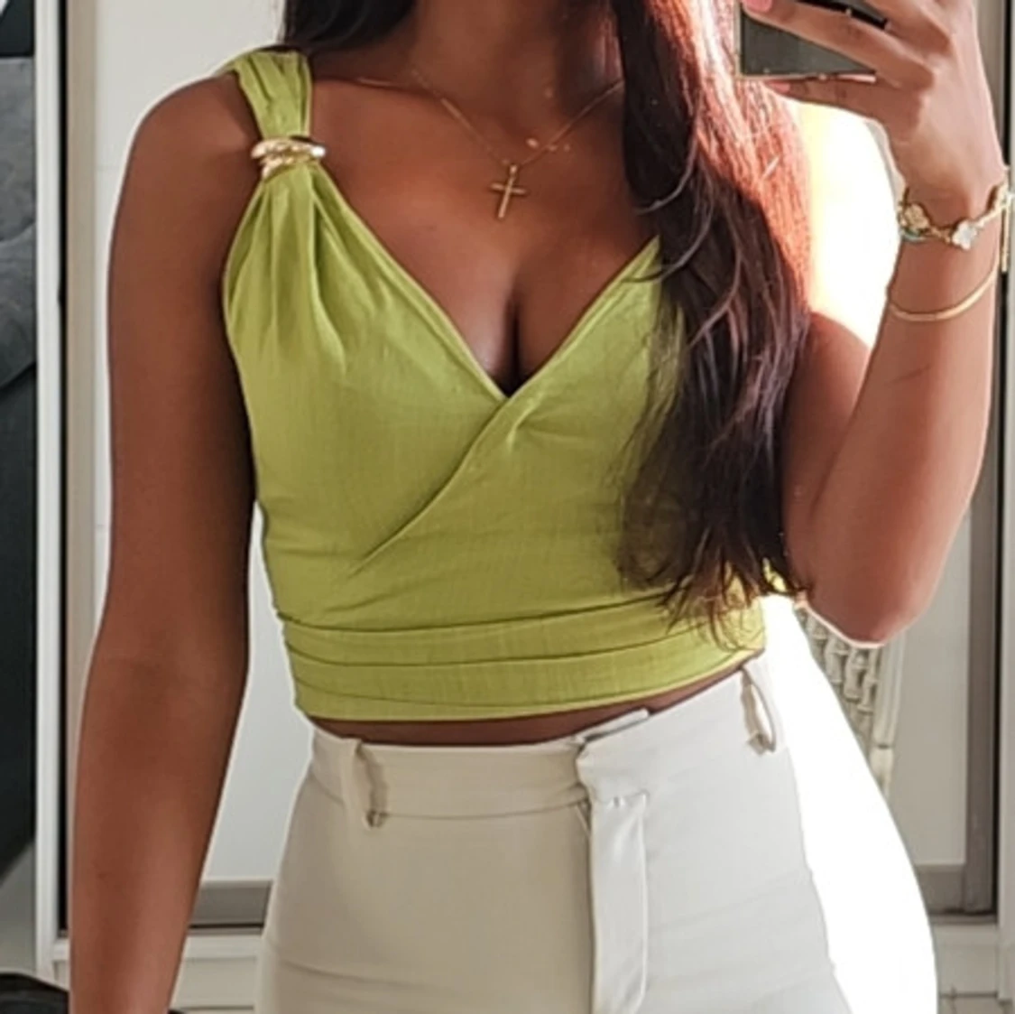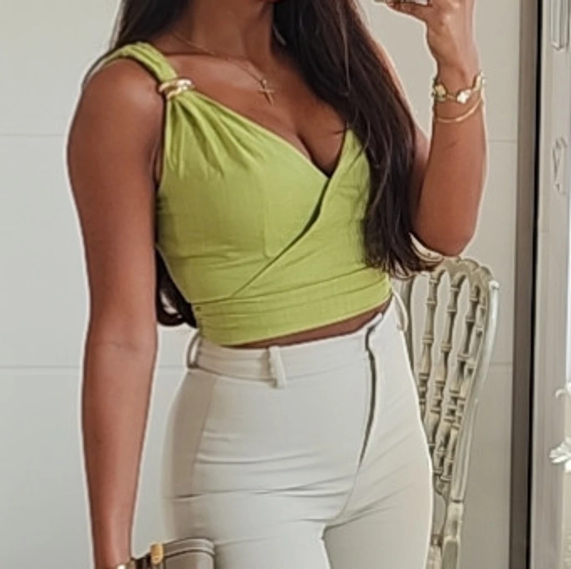 Snygg ljusgrön croppad linnetopp med omlott-skärning och breda axelband dekorerade med guldfärgade ringar. Toppen har djup v-ringning och sitter tight över kroppen, perfekt till höga byxor eller kjol.