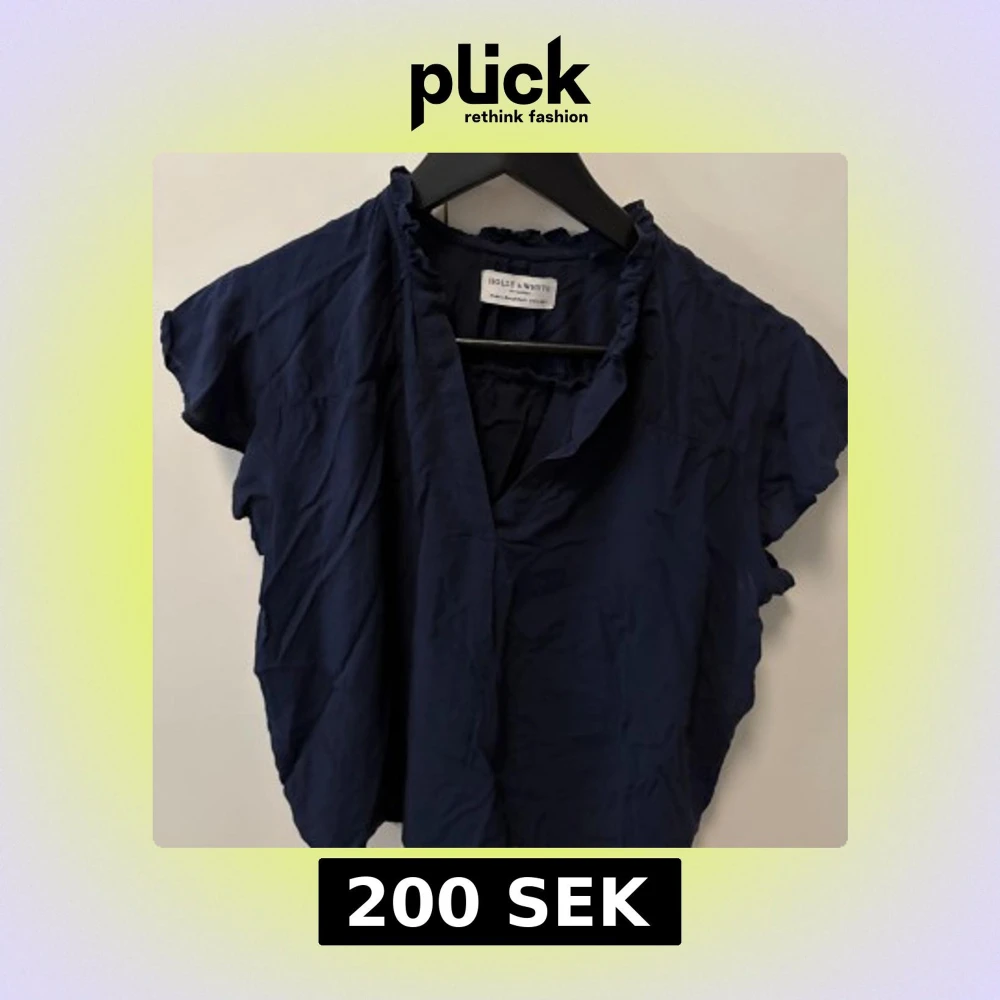 Supersöt mörkblå blus från Holly & Whyte med korta ärmar och volangdetalj vid kragen. Blusen har en avslappnad passform och lätt v-ringning framtill. Perfekt att styla med jeans eller kjol för en fräsch look.