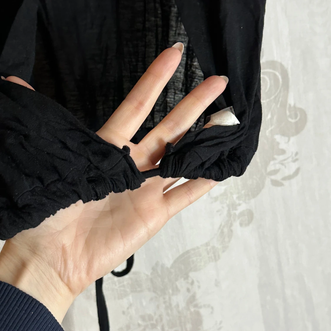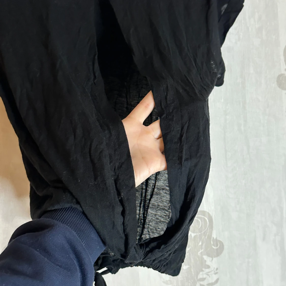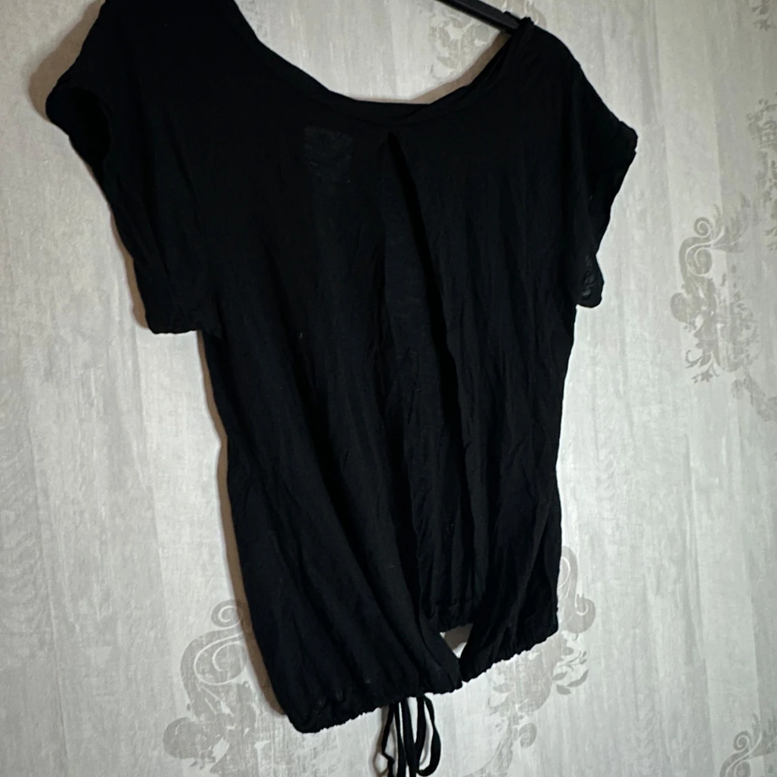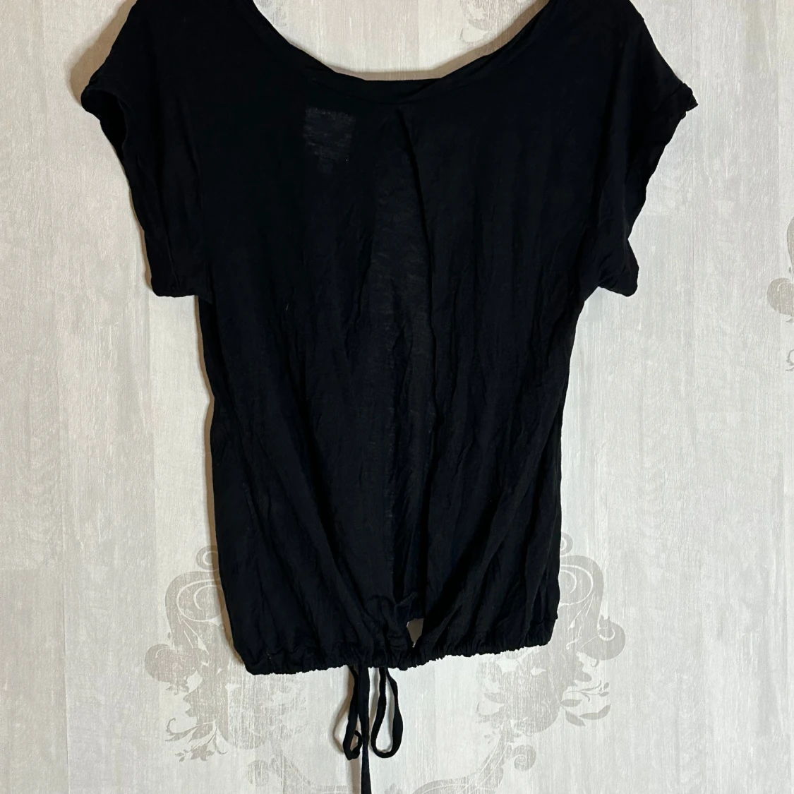 Säljer en svart kortärmad topp med knyt i nederkanten. Toppen har en lös passform och är perfekt för en avslappnad stil. Materialet är lätt och bekvämt.
