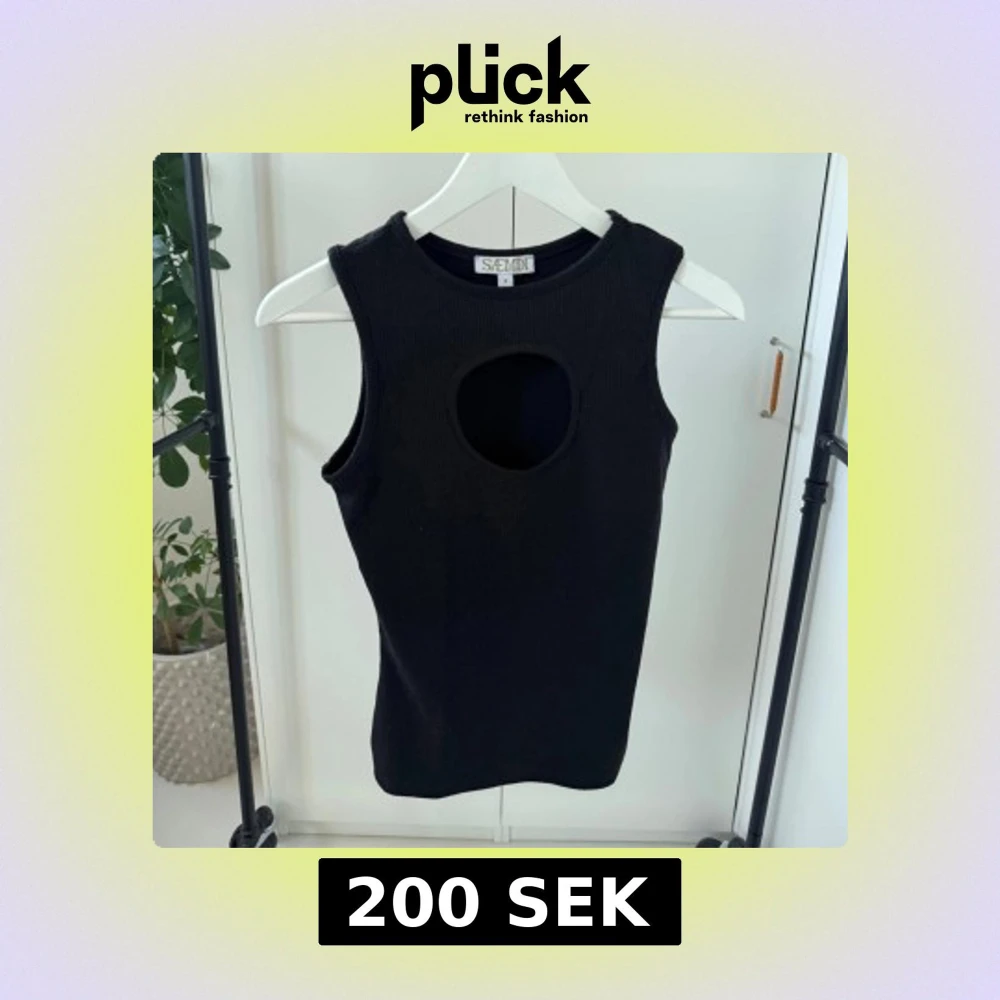 Snygg svart ärmlös topp från Saemdi med en unik cut-out detalj framtill. Toppen är ribbad och har en tight passform, perfekt för en trendig look. Passar bra till både jeans och kjol!