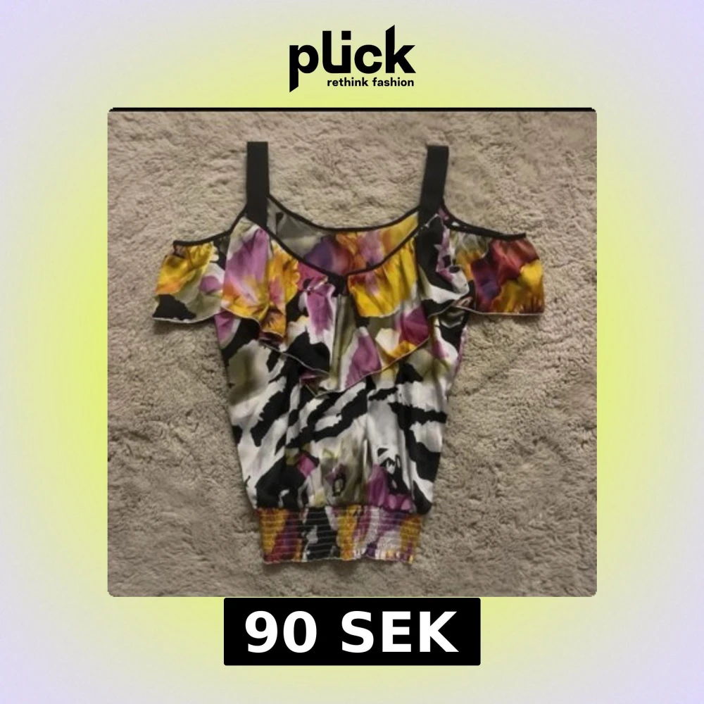 Säljer en färgstark blommig blus med offshoulder och breda svarta axelband. Toppen har volangdetalj framtill och elastisk smock vid midjan. Mönstret är en mix av lila, gul, svart, vit och orange i blommiga och abstrakta former. Perfekt för dig som gillar statement-plagg!