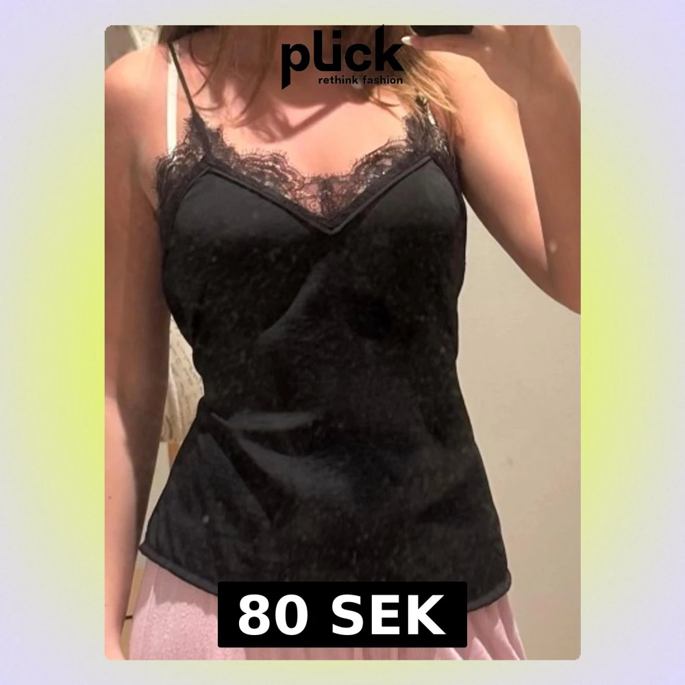 Snygg svart linnetopp med tunna axelband och spetsdetaljer längs urringningen. Toppen har en figurnära passform och är perfekt för att styla lager på lager eller bära som den är. Materialet känns mjukt och följsamt.