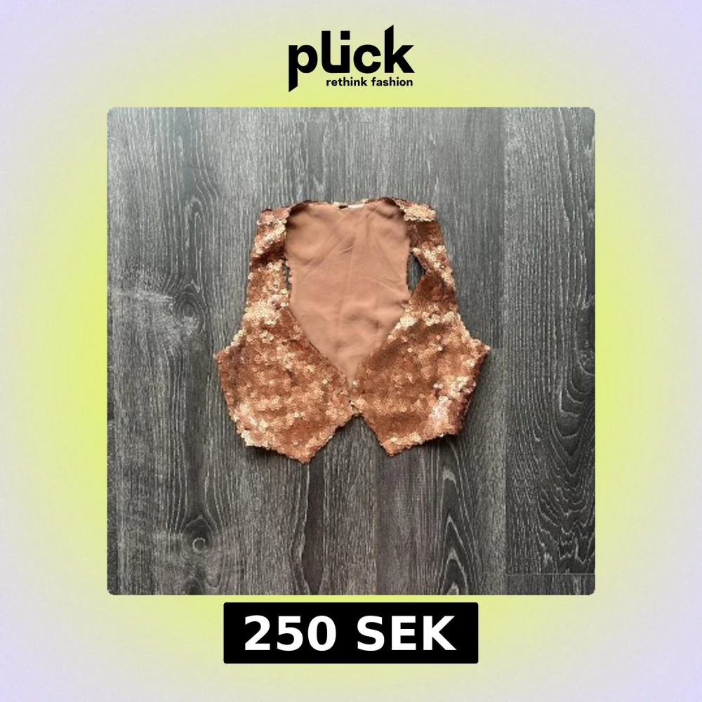 Glittrig väst i brons med tättsydda paljetter över hela framsidan. Modellen är ärmlös med djup v-ringning och hakar som knäppning framtill. Perfekt för att sticka ut och ge extra bling till din outfit.