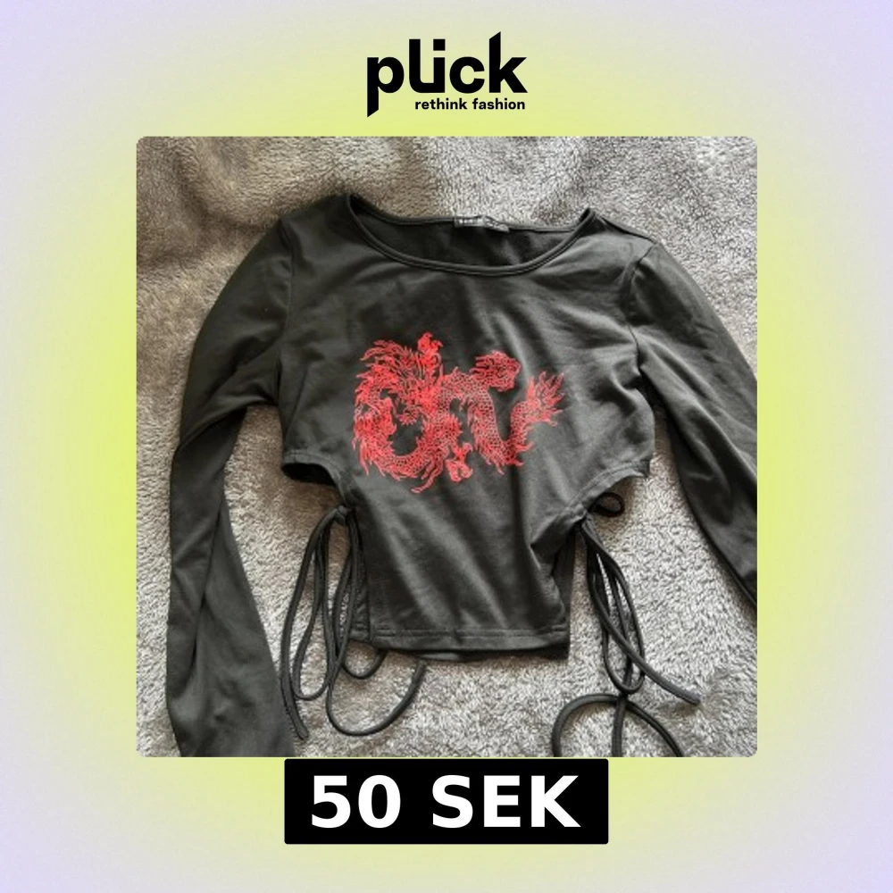 Cool svart croppad topp från SHEIN med lång ärm och snörning i sidorna. Framsidan har ett stort rött drakmotiv som verkligen sticker ut. Toppen är figurnära och gjord i mjuk bomullsmix, perfekt för dig som vill ha en edgy stil.