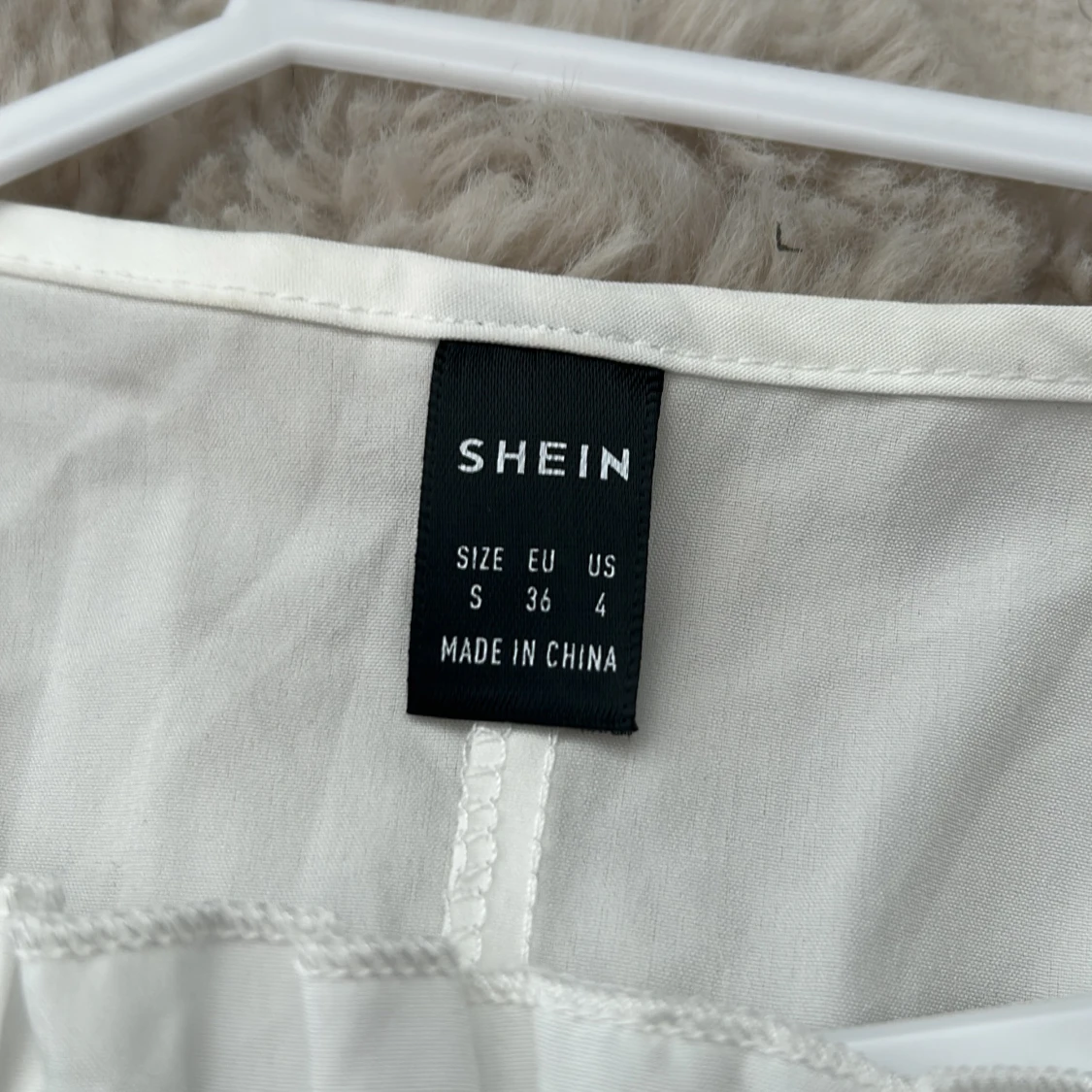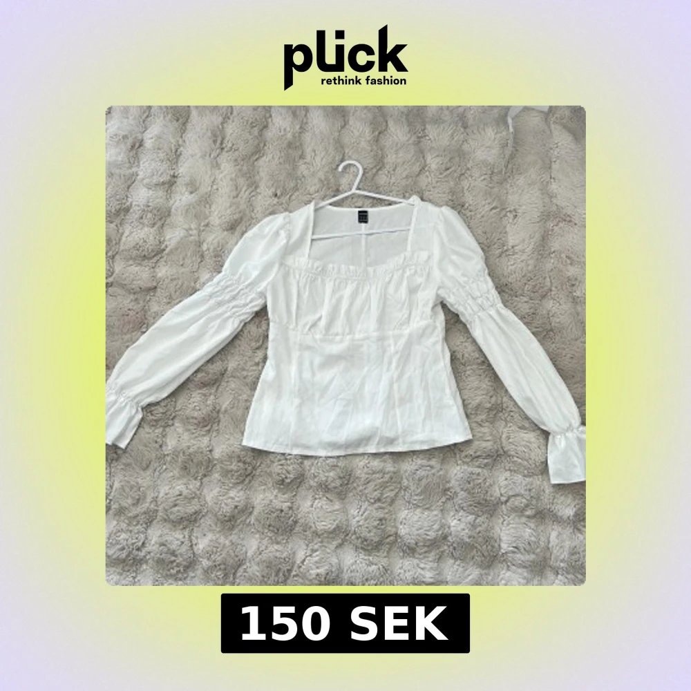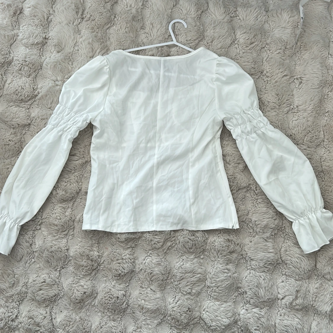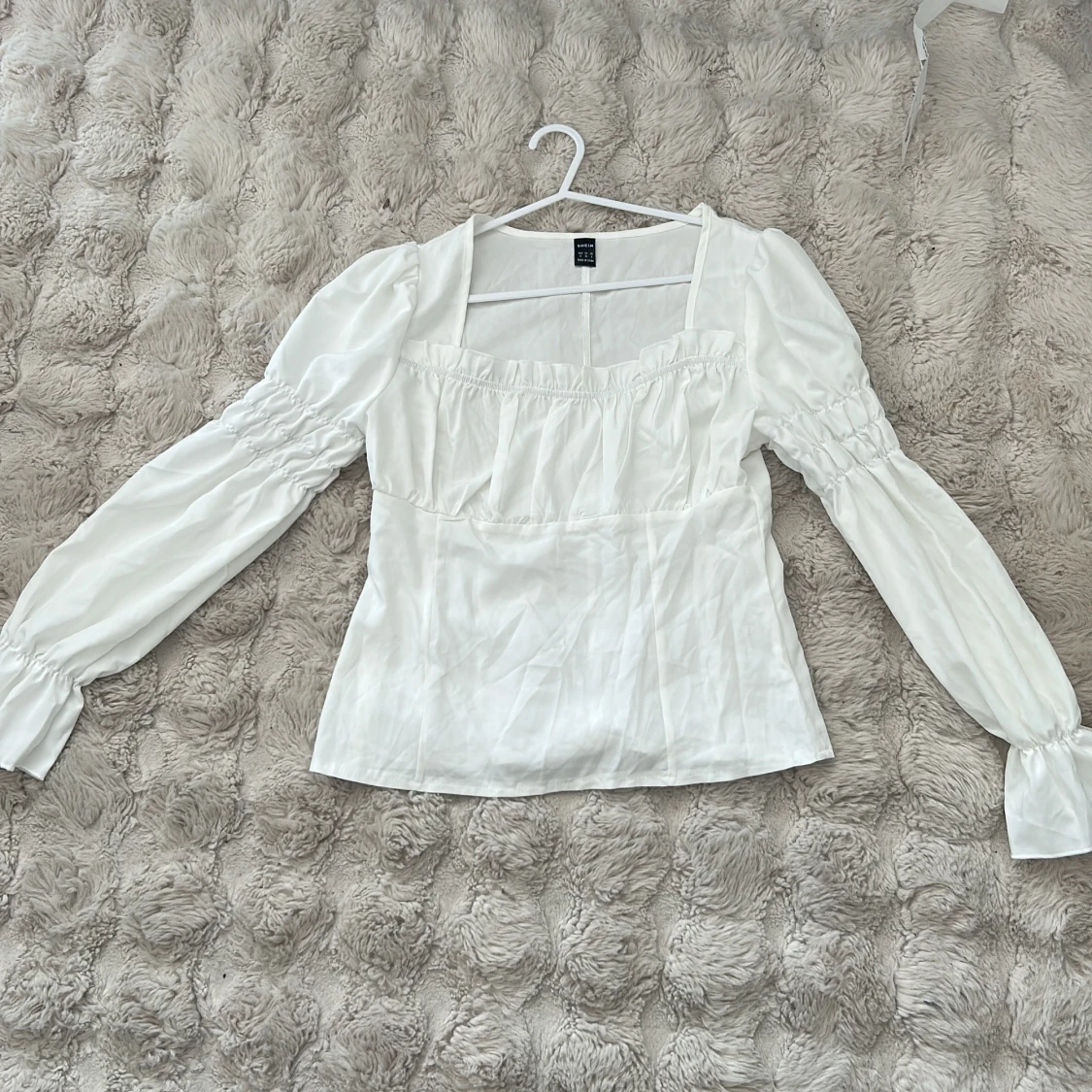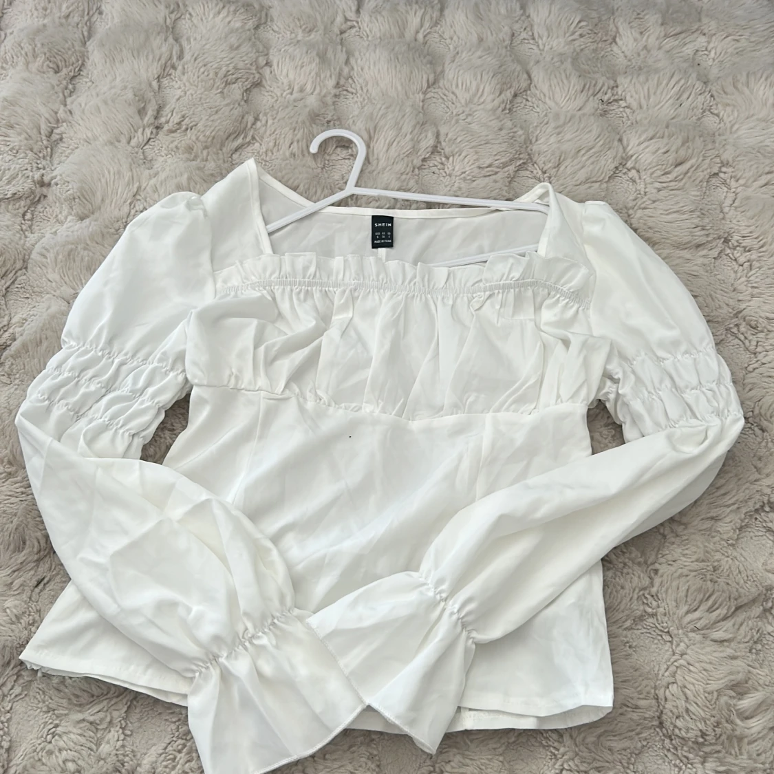 Supersöt vit blus från SHEIN i storlek S med puffiga långärmar och smockdetaljer vid ärmarna. Blusen har fyrkantig ringning och är figursydd i midjan. Perfekt för dig som gillar romantisk och trendig stil.