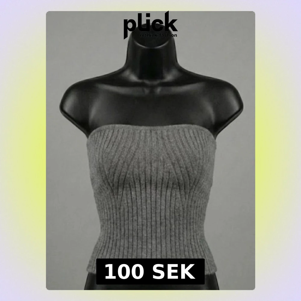 Säljer en grå ribbad tubtopp i stickat material. Toppen är axelbandslös och har en bandeauformad passning som sitter snyggt och tight mot kroppen. Perfekt att styla med höga jeans eller kjol för en trendig look.